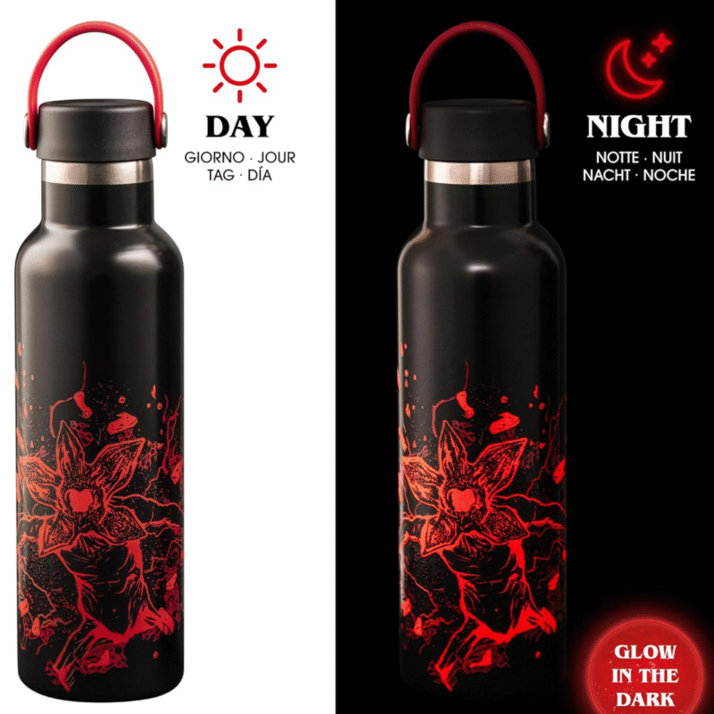 • GLOW IN THE DARK EFFECT: The Demogorgon glows intensely red in the dark; Capacity: 600 ml, 20 oz; Double wall product; Waterproof product; Ribbon for better holding