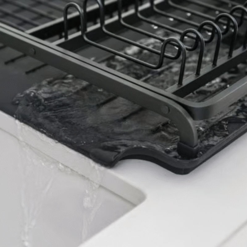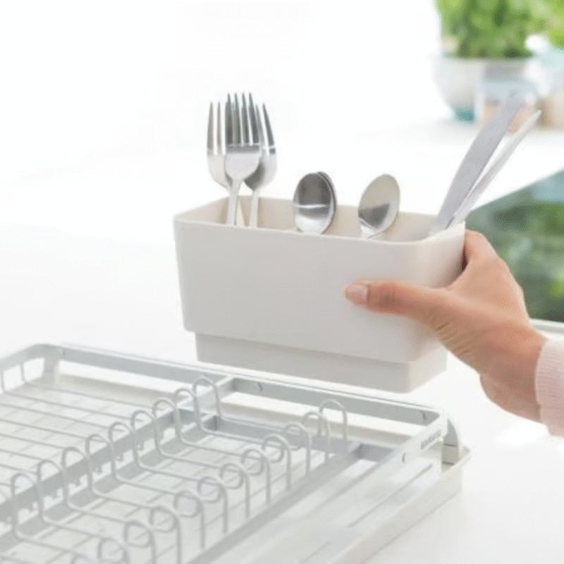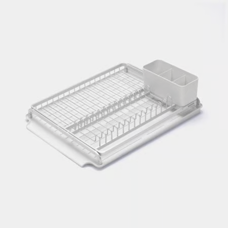 This Brabantia SinkSide Dish Drying Rack is designed for keeping your dripping dishes. It has a sleek design, but space for up to 13 plates plus bowls, cutlery and glasses. It has a removable cutlery basket and a sloping drip tray too, so drippings run directly into the sink. This rack is on track!