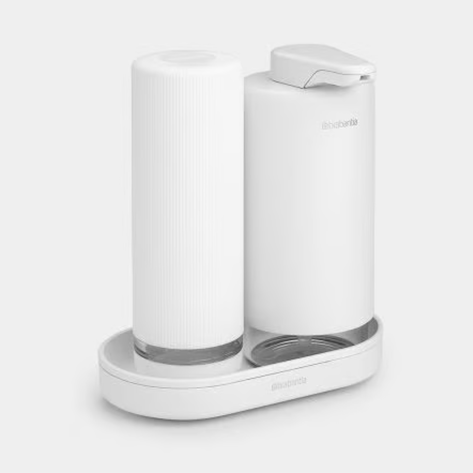 Bring great style to your kitchen with the Brabantia SInkStyle Soap Dispenser Set. Two stylish dispensers for your hand and dish soap on a textured metal tray. These beauties don’t just dispense soap, they ooze style. From the textured body of the Soap Dispenser to its see through holder. And the Soap Squeezer that releases washing up liquid when you squeeze it. Two sparkling examples of Brabantia’s hands-on designs.