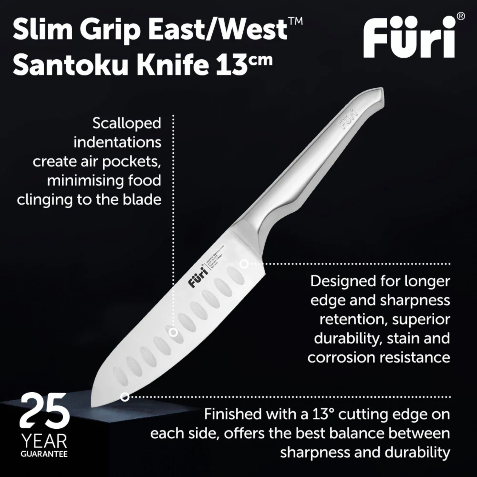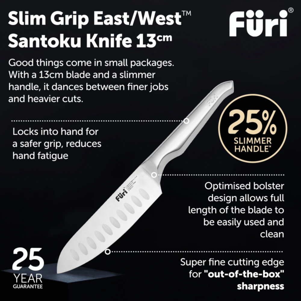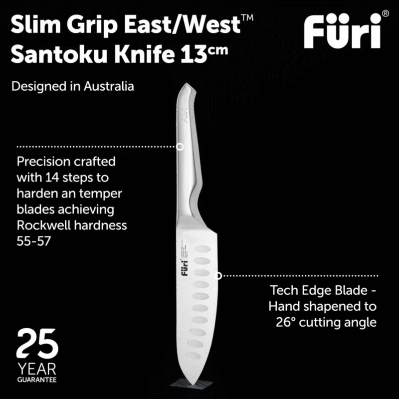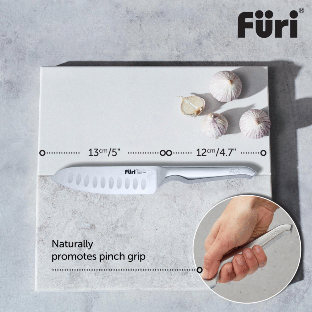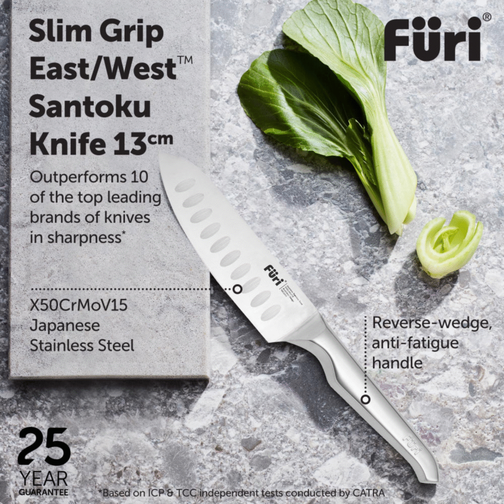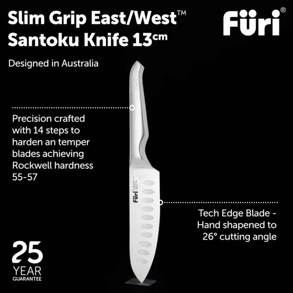 Furi Pro knives, constructed from X50CrMoV15 Japanese stainless steel, offer unrelenting sharpness and stay sharp for longer. Furi Pro knives are cut differently and are seamless from the tip to the heel, making the knives easier to clean and maintain.