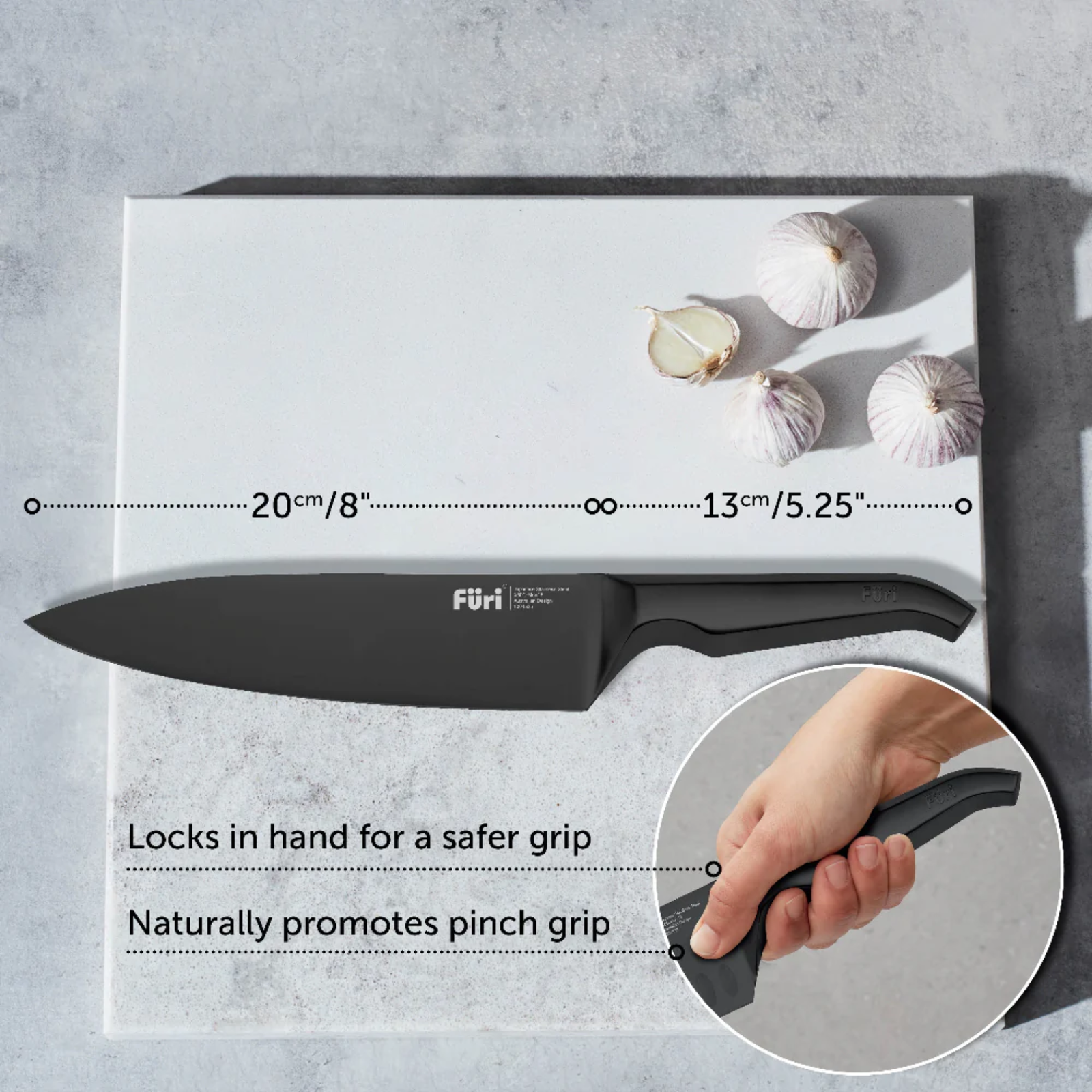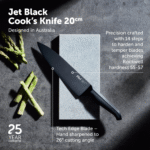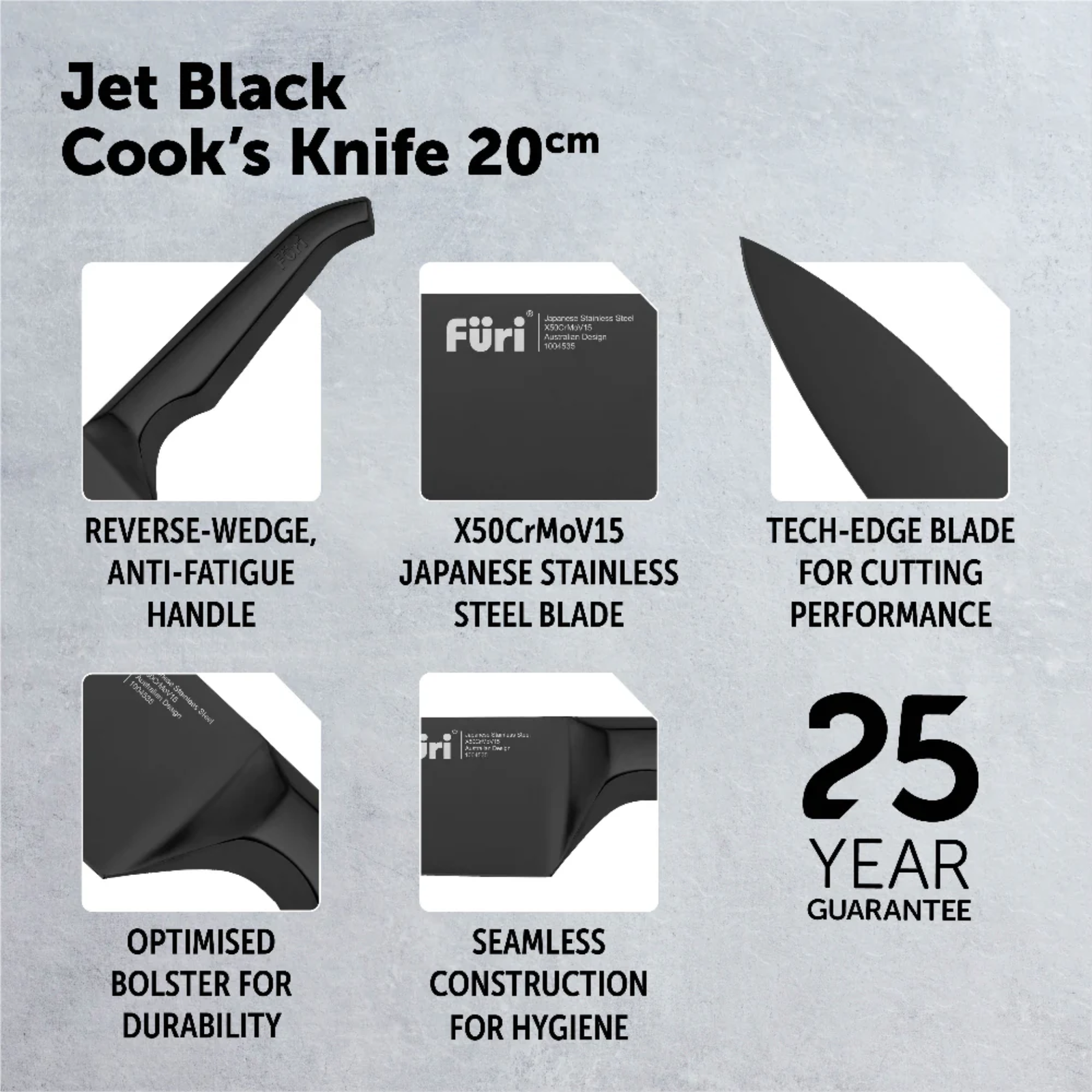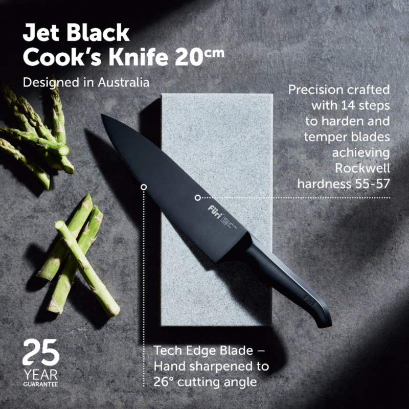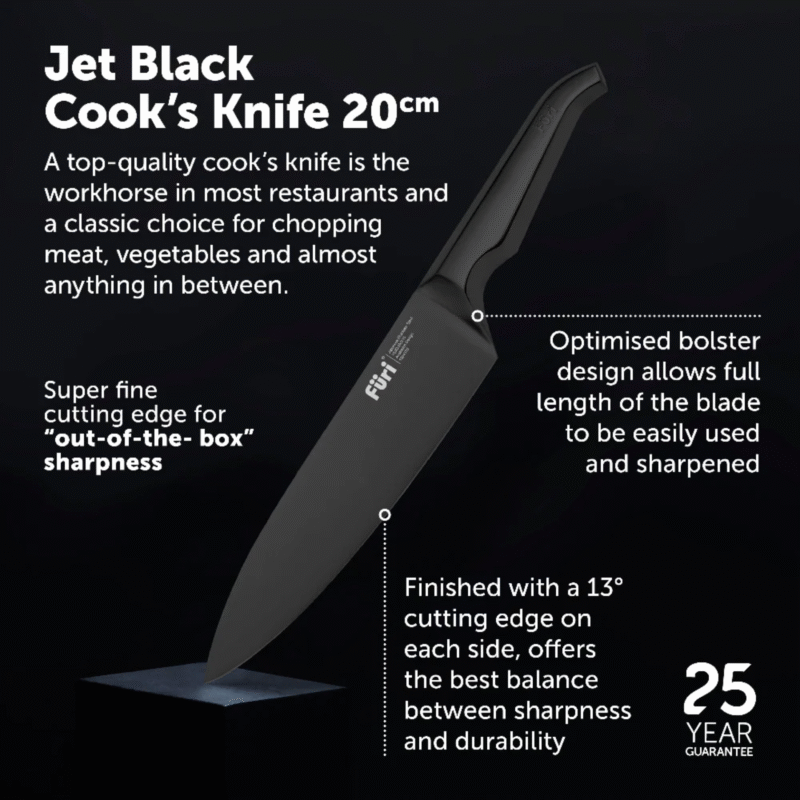 The Furi Pro Jet Black range combines superior cutting performance with the innovative Furi reverse-wedge anti-fatigue handle. Slick. Simple. Stylish. Designed for both the professional chef and home cook. The matte, striking jet black oxidised finish, which is an advanced surface treatment integrated into the steel of the knives, making them highly scratch resistant.