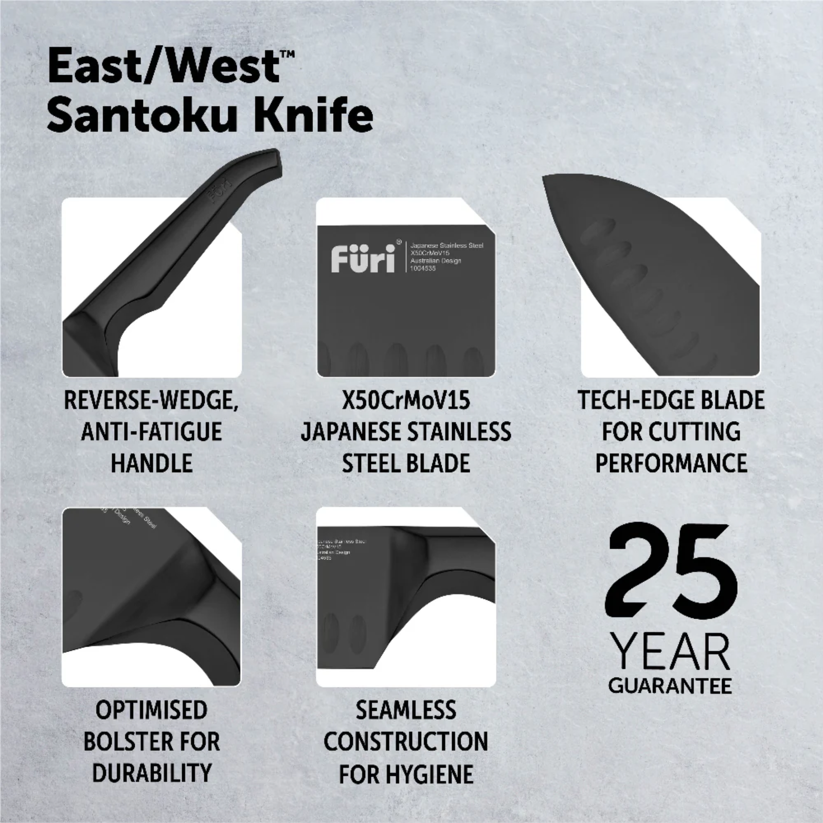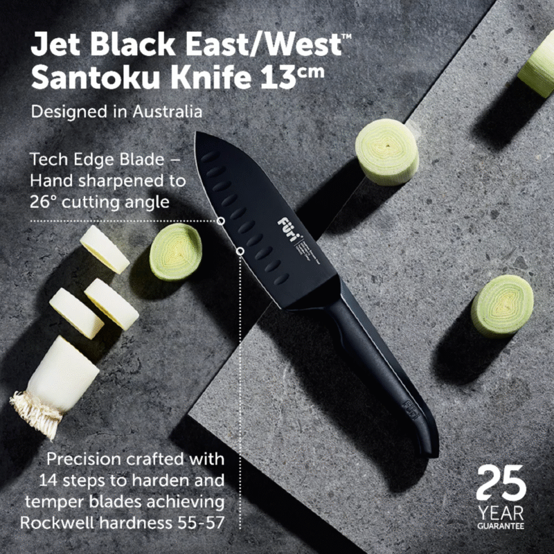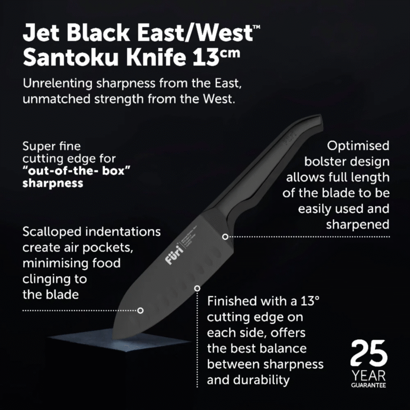 The Furi Pro 13cm East/Westâ„¢ is a petite edition of the iconic 17cm version. Engineered with a deep blade for larger cutting tasks but still short and nimble enough for smaller jobs. Extra leverage for those heavier cuts is achieved from the oversized handle. Scallops intuitively positioned on the blade reduce friction & make cutting fast & easy.
