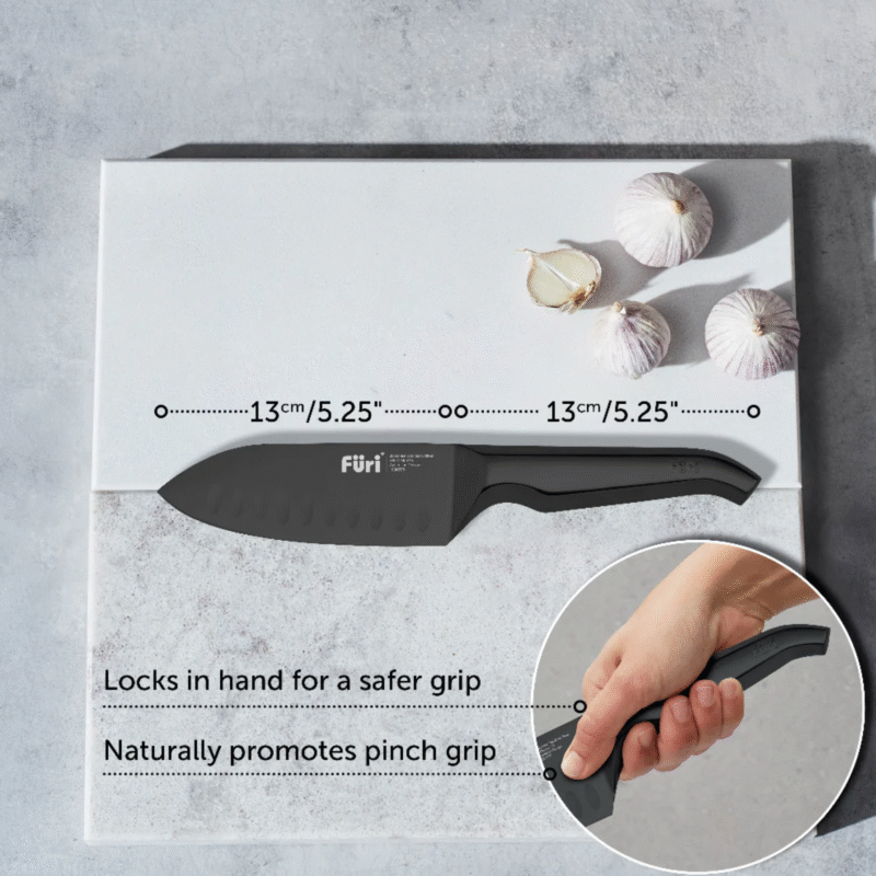 The Furi Pro Jet Black range combines superior cutting performance with the innovative Furi reverse-wedge anti-fatigue handle. Slick. Simple. Stylish. Designed for both the professional chef and home cook. The matte, striking jet black oxidised finish, which is an advanced surface treatment integrated into the steel of the knives, making them highly scratch resistant.