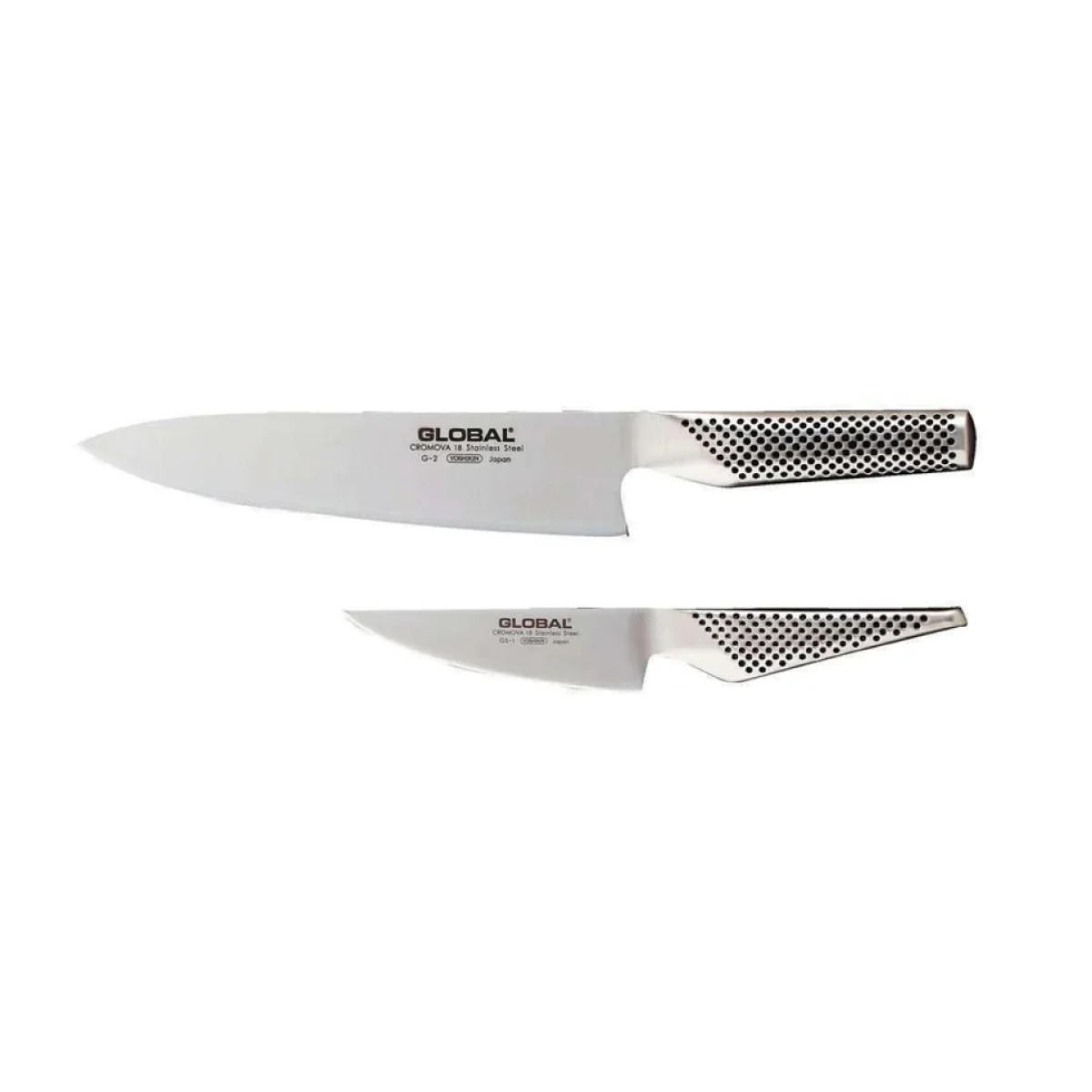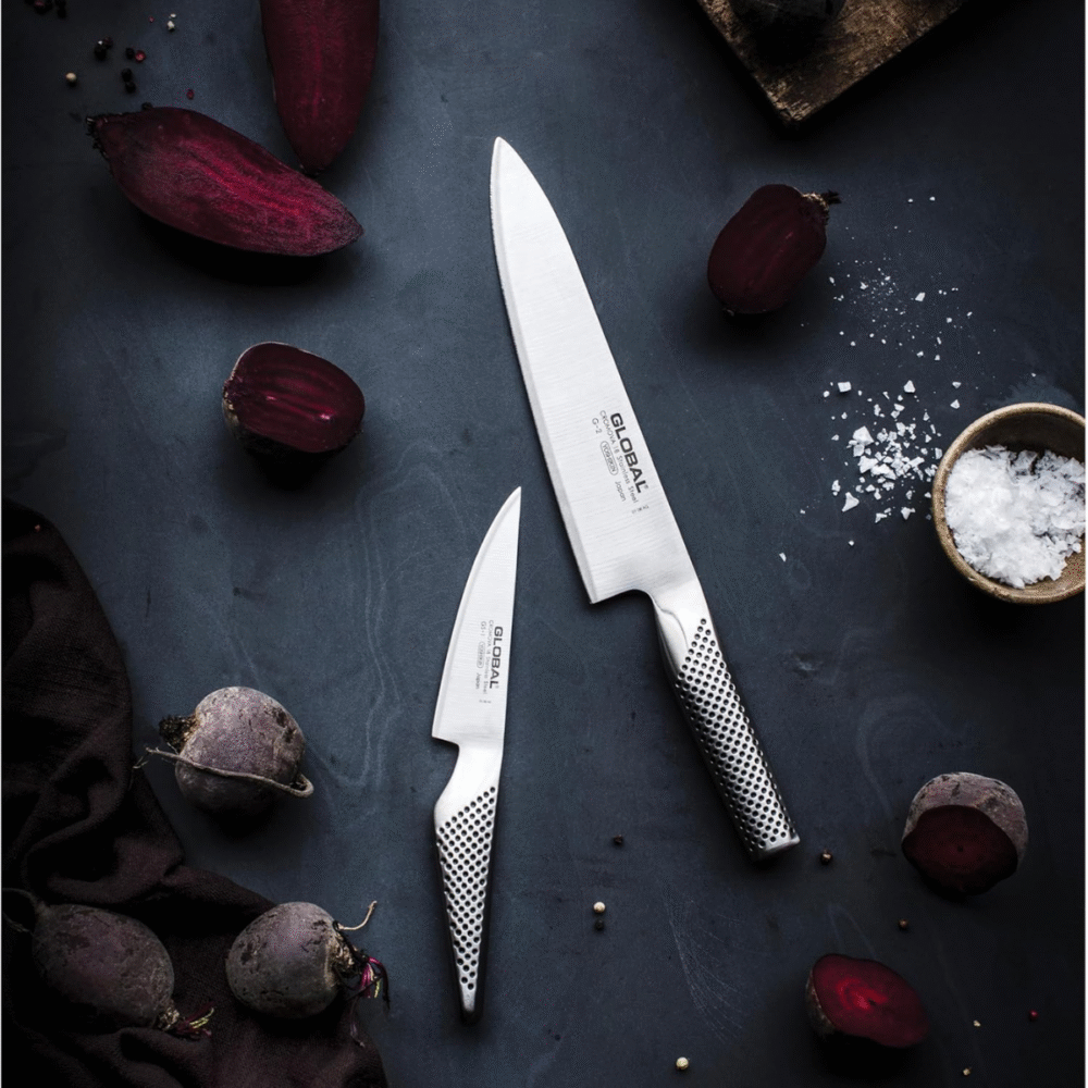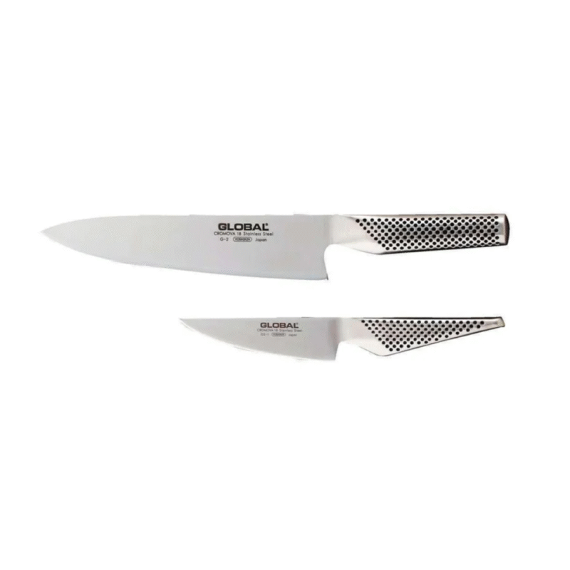 The Global 2 Piece Knife Set is a practical start your Global knife collection. It contains 2 kitchen workhorse that you cannot live without, the G2 Chef’s Knife and the GS1 Paring Knife. The G2 Chef’s Knife is perfect for mincing, cutting, chopping, slicing and prep work, while the GS-1 is the smallest stated cook’s knife in the Global range and is used for cutting, slicing and chopping.