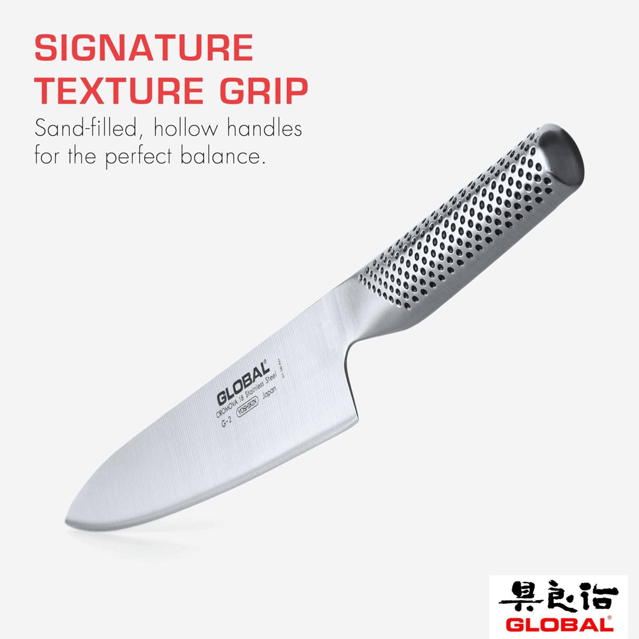 Both knives feature Global’s signature CROMOVA 18 stainless steel alloy. This high-quality steel is highly corrosion-resistant and maintains its sharp edge for longer performance. The knives feature a unique dimpled handle that is comfortable to hold and ensures a secure grip while cutting.