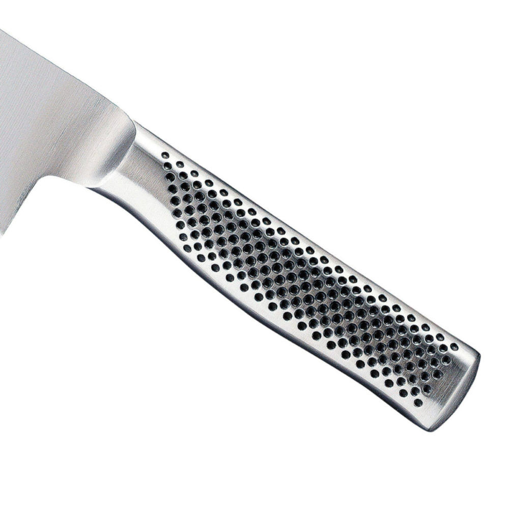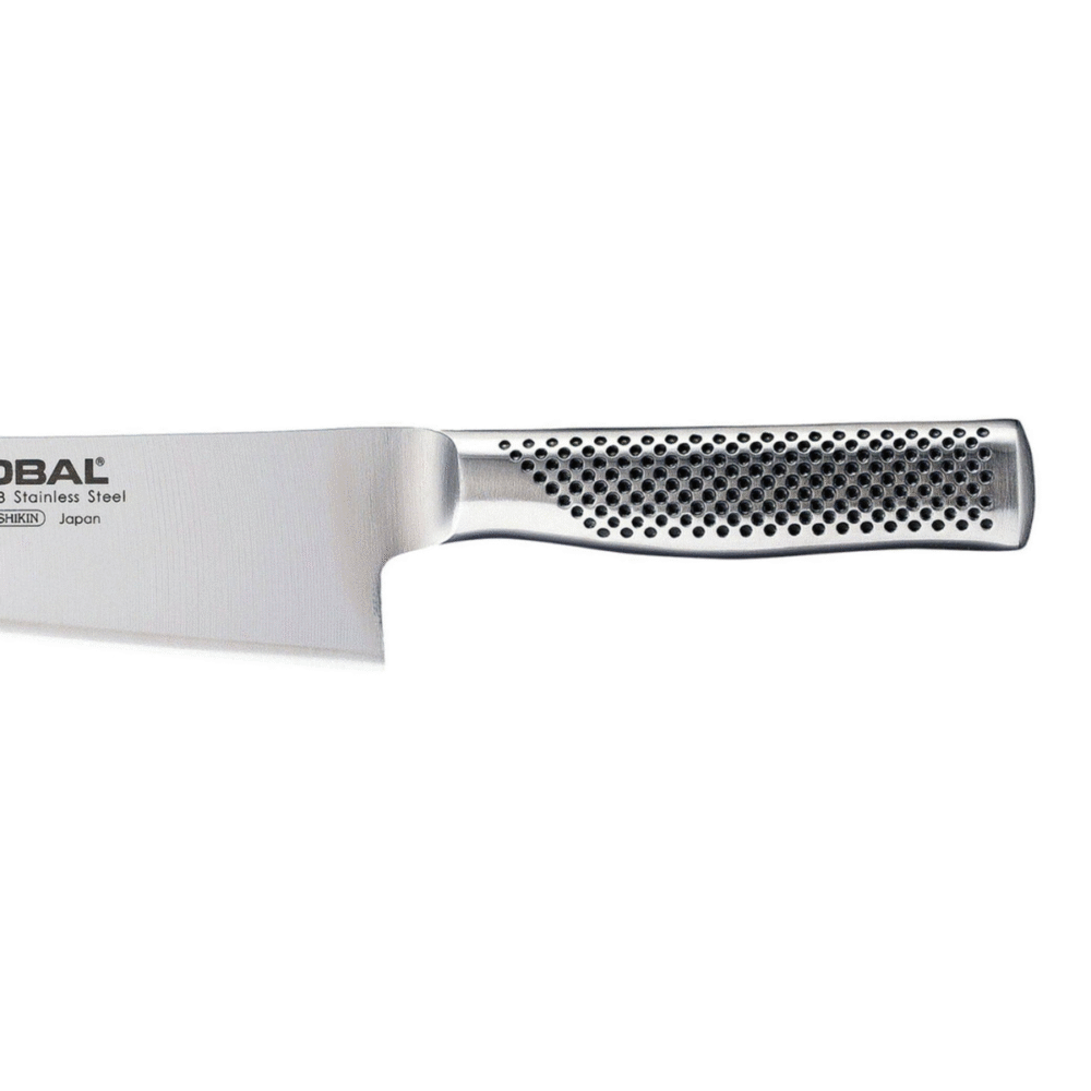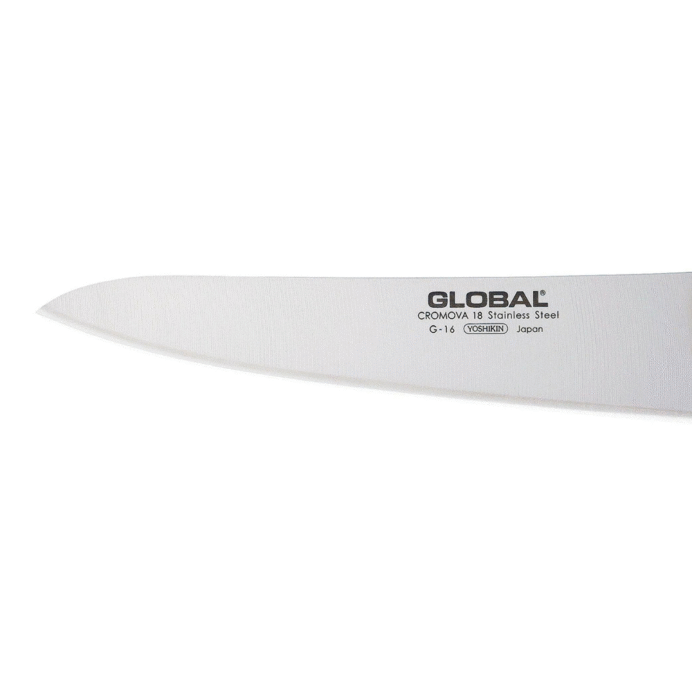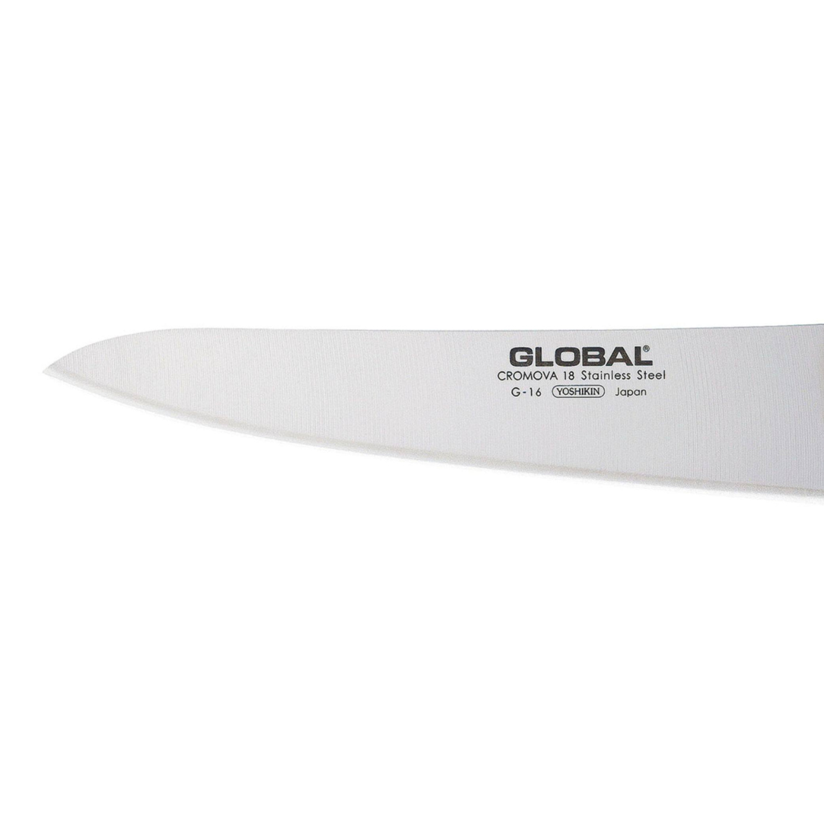 The G-16 is made from CROMOVA 18 stainless steel, specially developed by GLOBAL as it holds a razor-sharp edge and resists rust, stains and corrosion. Ice tempered and hardened to Rockwell C56-58, each knife is carefully weighted by filling the handles with sand to achieve the optimum weight and perfect balance. Other unique features include its smooth contours and seamless construction which eliminates food and dirt traps offering the ultimate in safety and hygiene. The acute 15-degree angle cutting edge provides unsurpassed performance and superior edge retention.