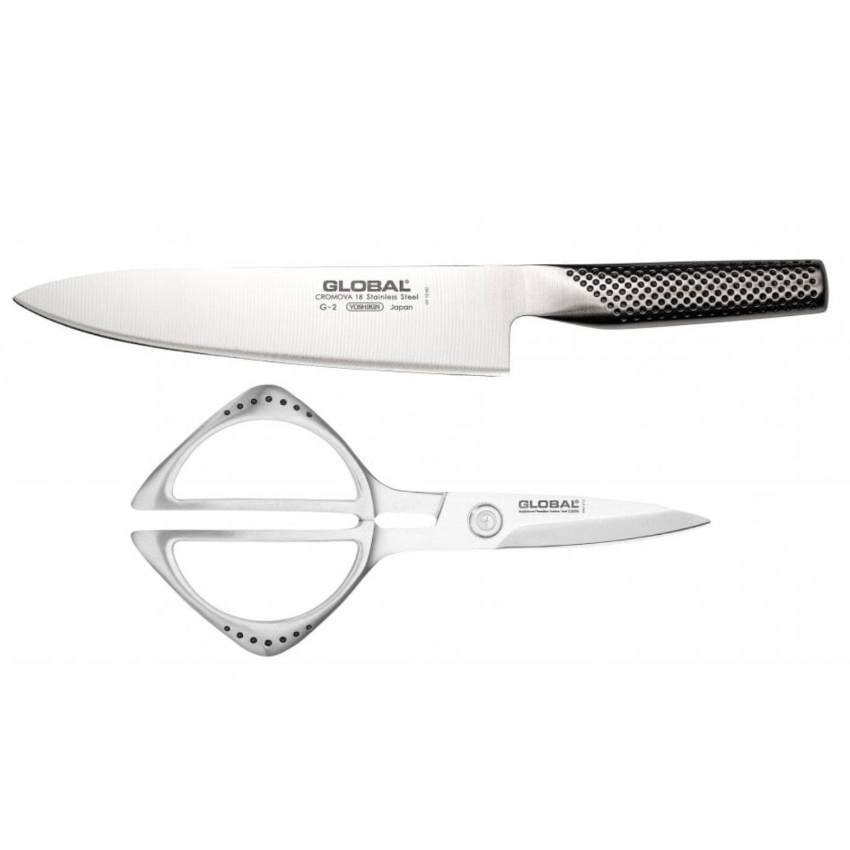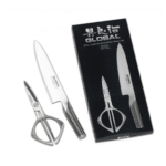 Global Knives are proud to produce a matching set of kitchen shears to compliment your range of Global kitchen knives. These scissors feature heavy weight cast steel handles and feel very substantial whilst held. The steel blades are thick and strong and contain small teeth to help grip chicken fillets and other meats. Between the handles you will also fit a nut cracker. These sicssors will also fit into the butcher’s steel slot on most ship shape type Global blocks.