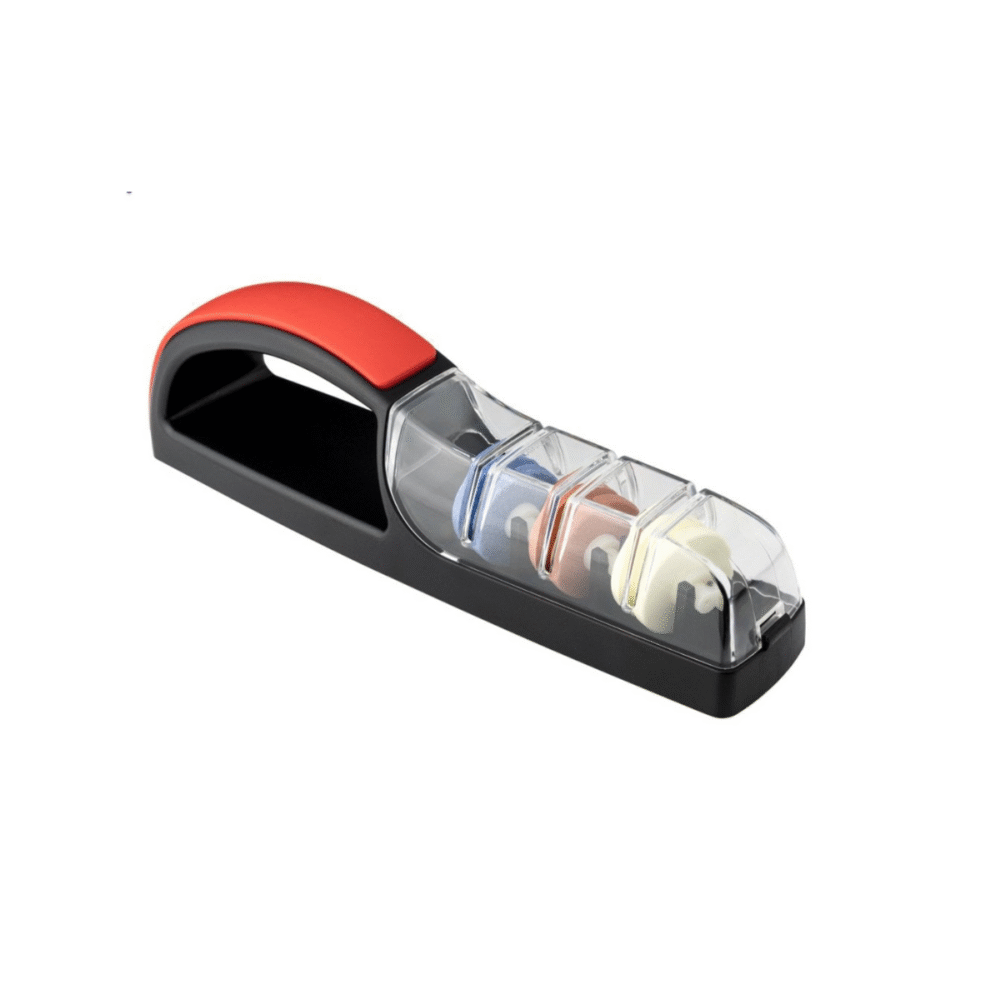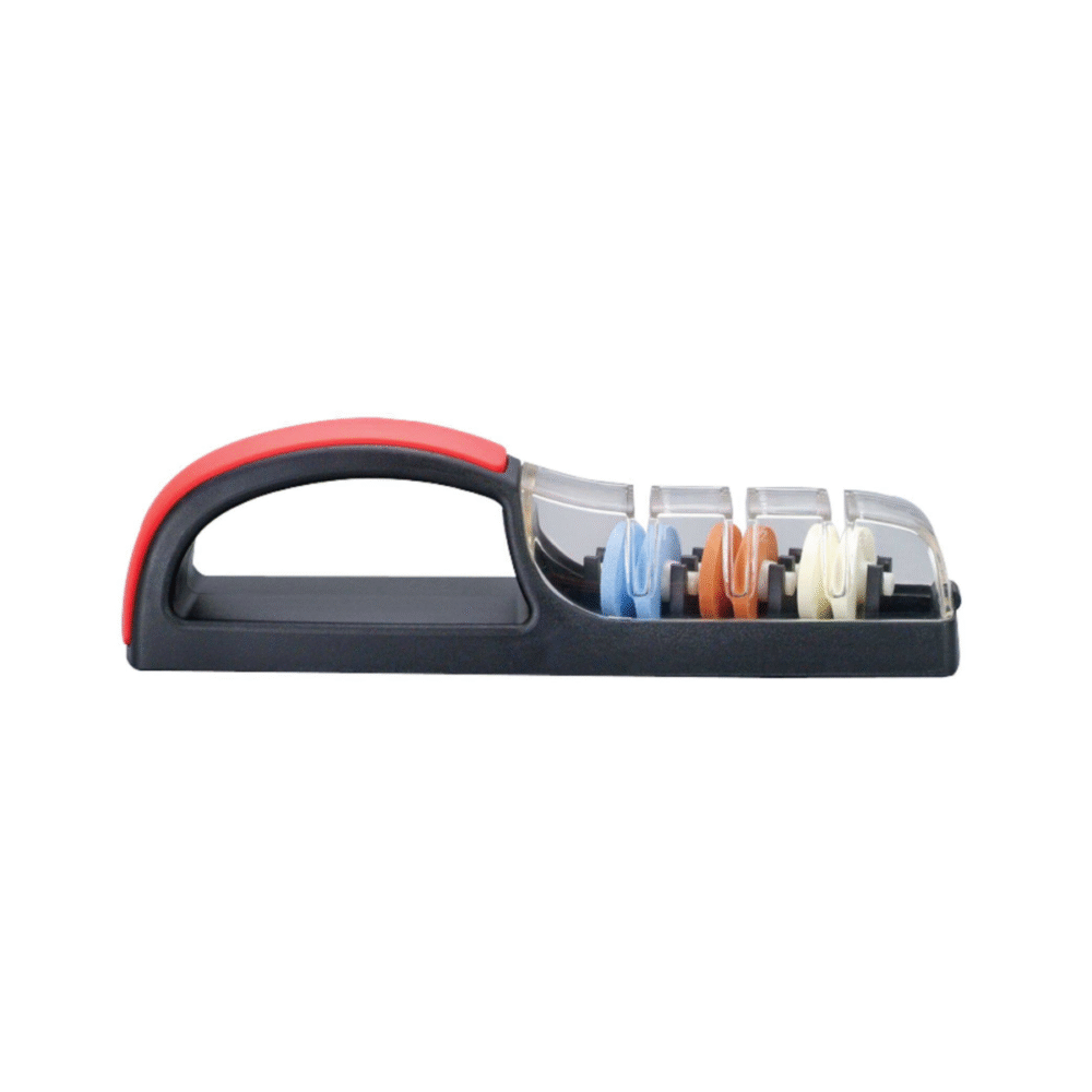 Small and easy to use sharpeners for your knives. There are three wheels, rough, medium and fine to put a new edge on your knife. Simply fill the container with water and run your knives back and forth through the slots applying moderate pressure.