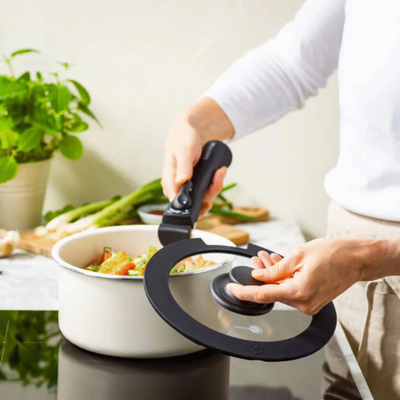A space-saving solution with big performance, Click Chef streamlines your stovetop with high-wall pots and pans and an ingenious detachable handle. The handle clips on and off to eliminate stovetop crowding, make transfers effortless and cleaning easy. Pots and pans can be stacked on top of each other for easy storage, making them perfect for saving space.