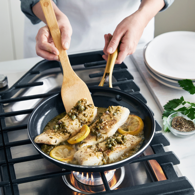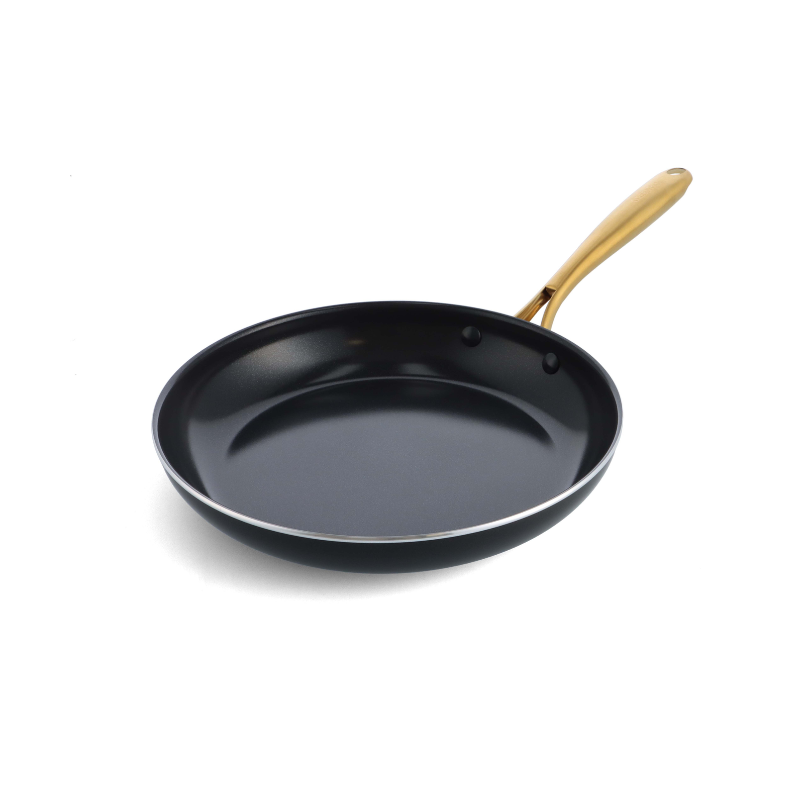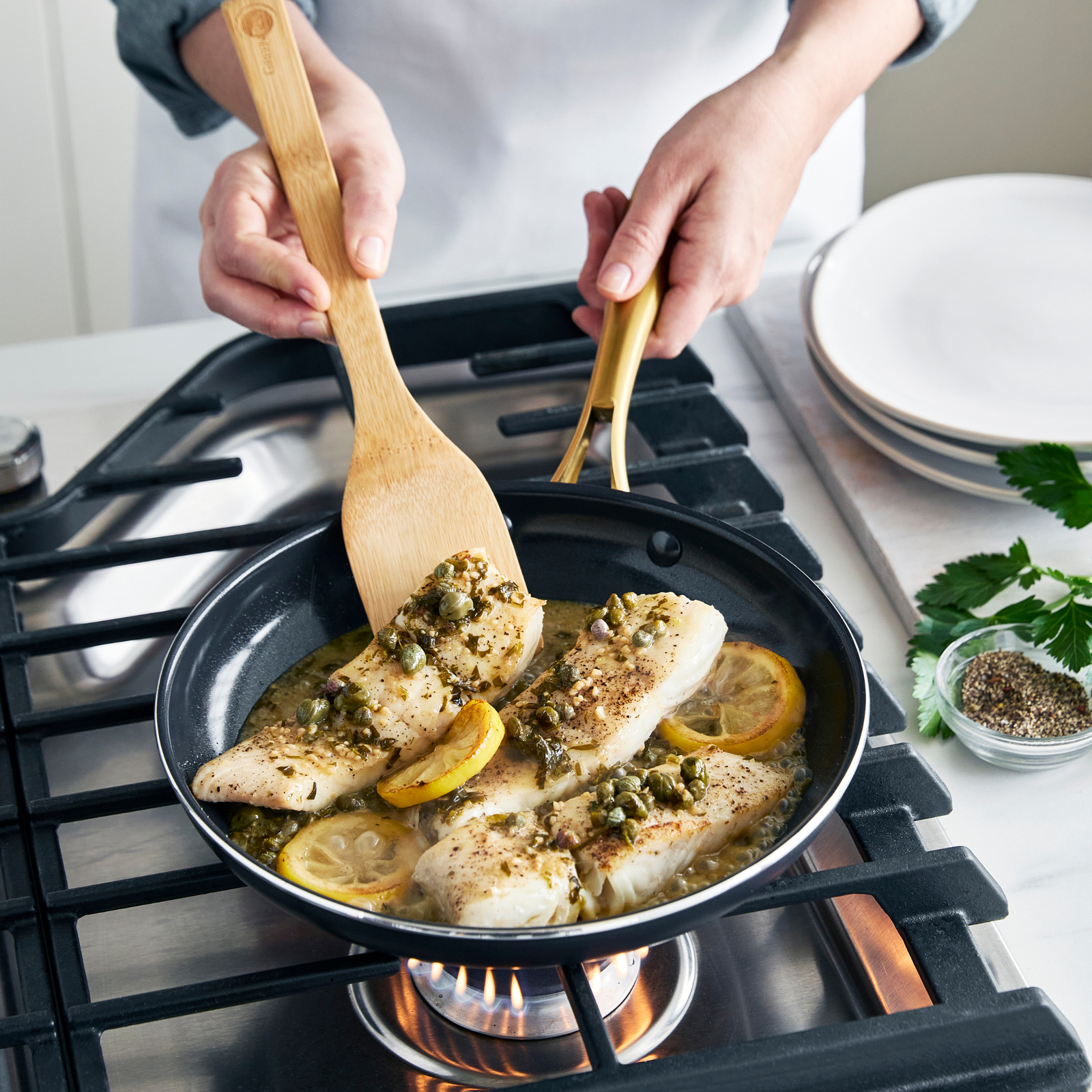 The GreenPan Studio Collection features state-of-the art technology, with an added dash of extra-stylish design. (Note: the stunning gold-tone handles, which have a corrosion-resistant finish) Throughout the line, the ceramic nonstick coating boasts diamond-enhanced layers for added durability. And the heavy-gauge aluminium bodies deliver excellent heat conduction. All of GreenPan’s cookware, this line is free of PFAS, PFOA, lead, and cadmium.