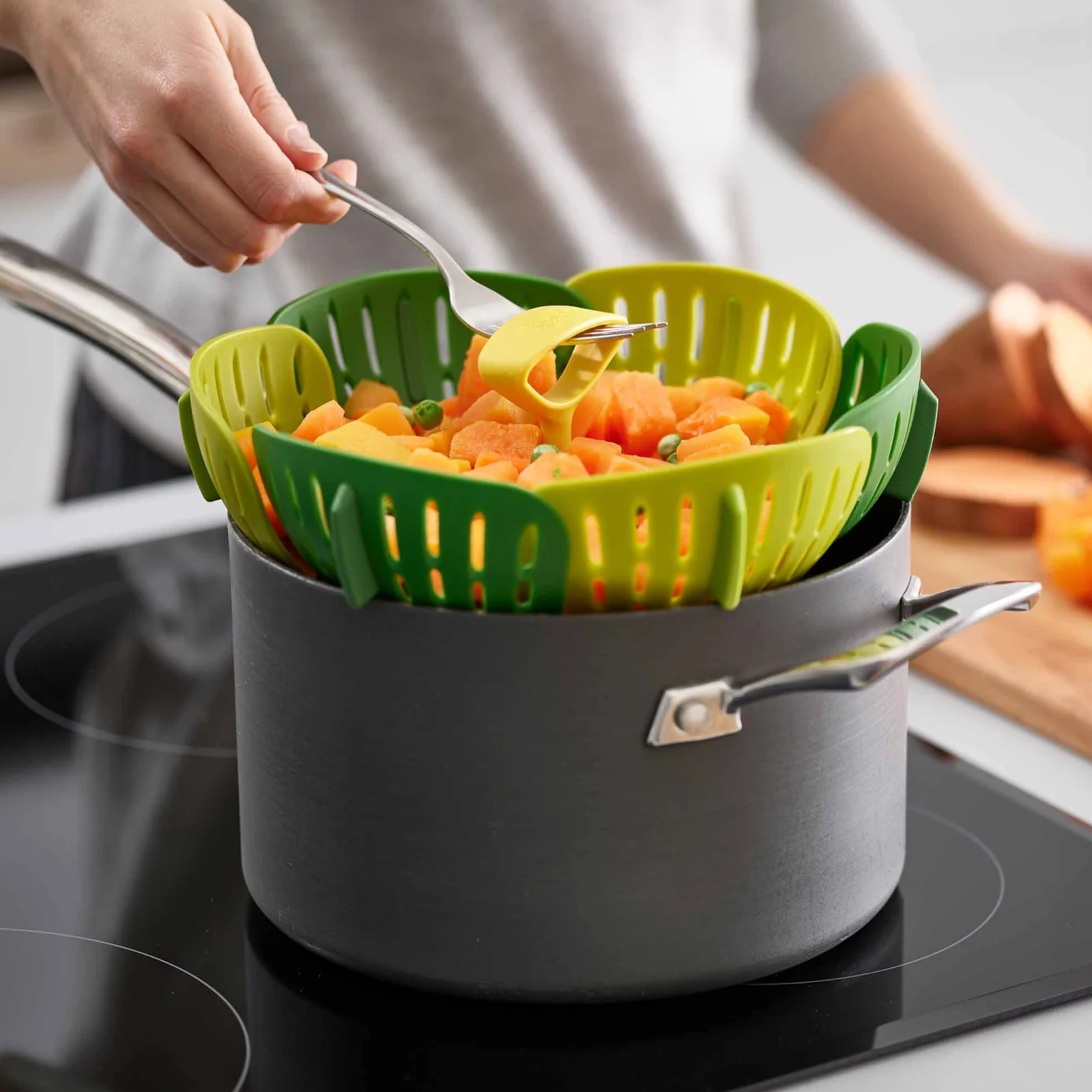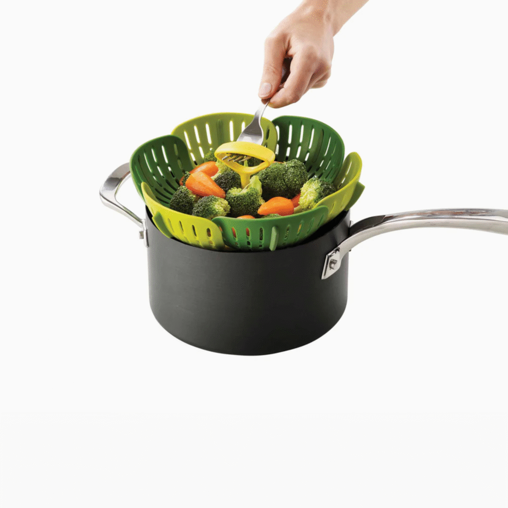 With its self-adjusting sides, heat-resistant silicone feet and silicone side fins, this folding steamer basket is perfect for using with both non-stick and stainless-steel cookware.