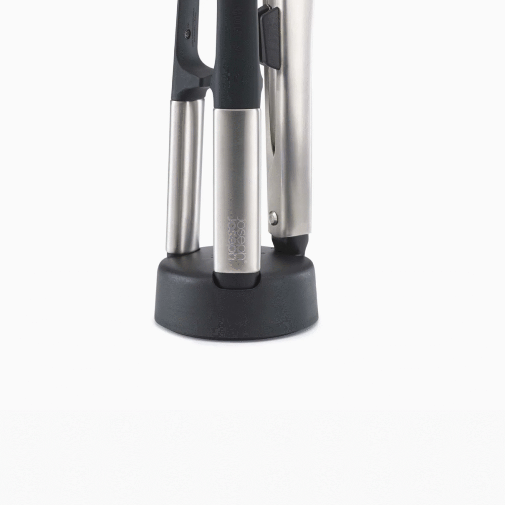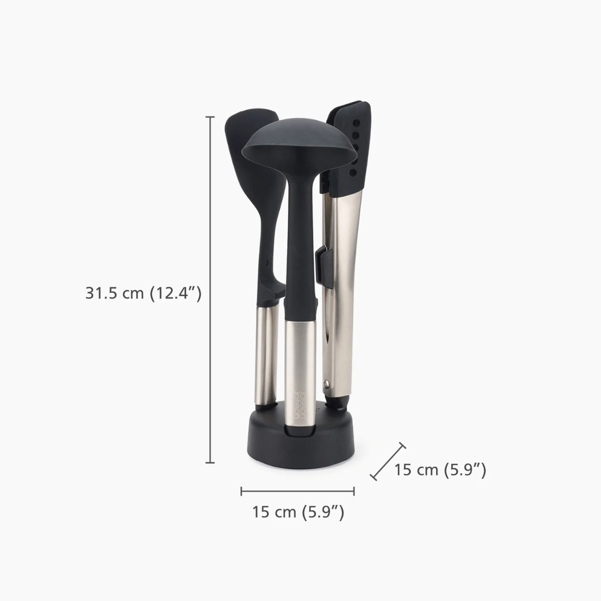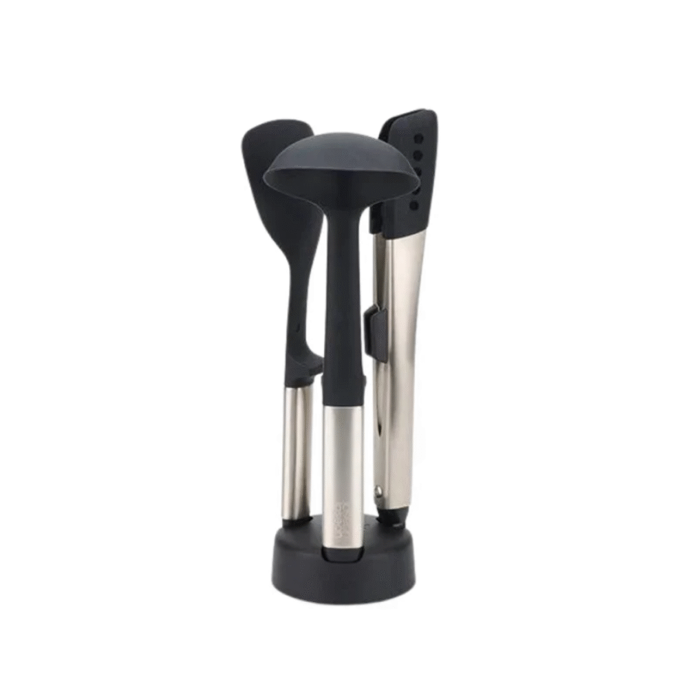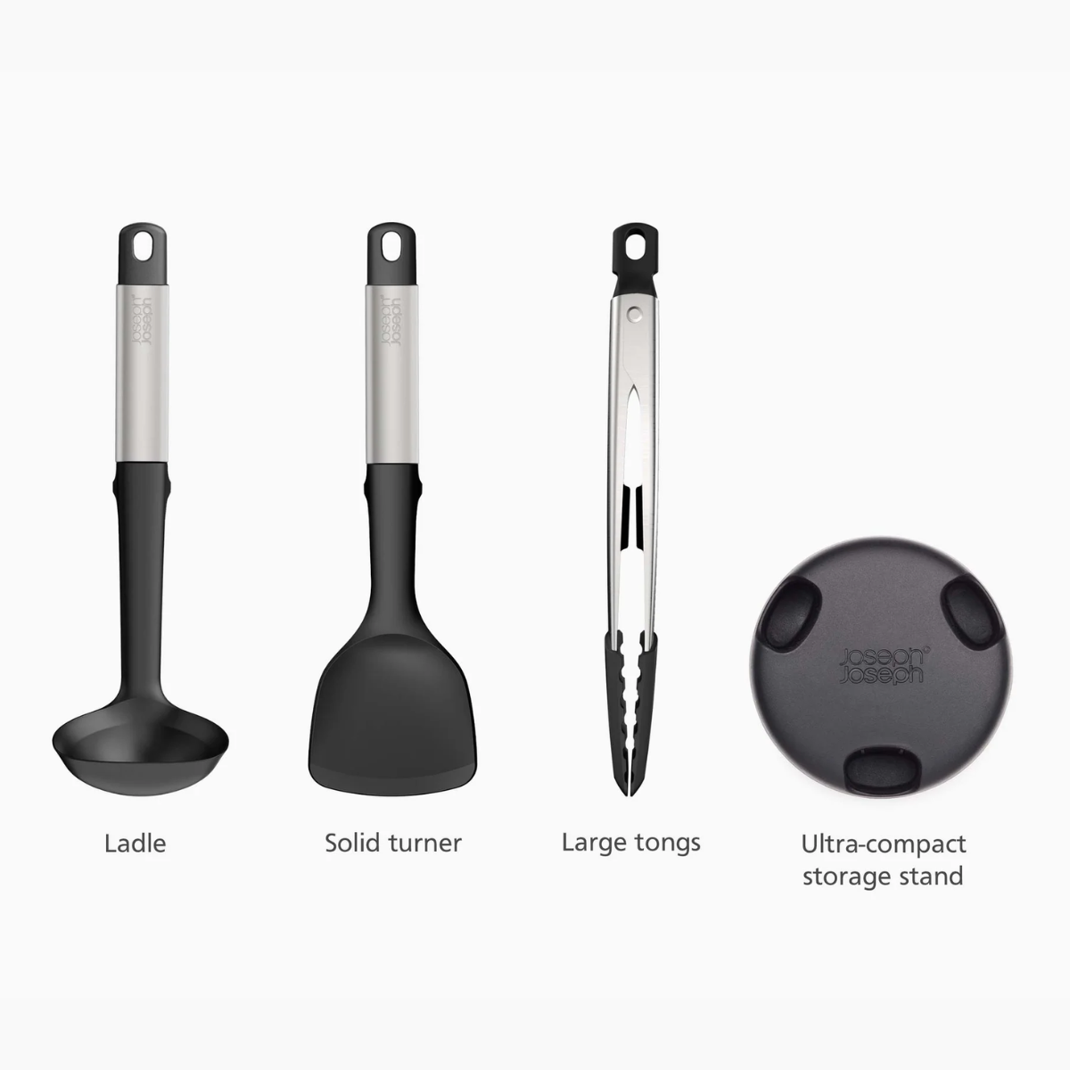 Elevate technology designed to improve hygiene and reduce mess Weighted steel handles and integrated tool rests prevent utensil heads from touching the work surface when placed down Silicone utensil heads heat-resistant up to 210˚C/410˚F Silicone tong tips heat-resistant up to 270˚C/520˚F Suitable for non-stick cookware Compact storage stand Set includes solid turner, ladle and a pair of tongs