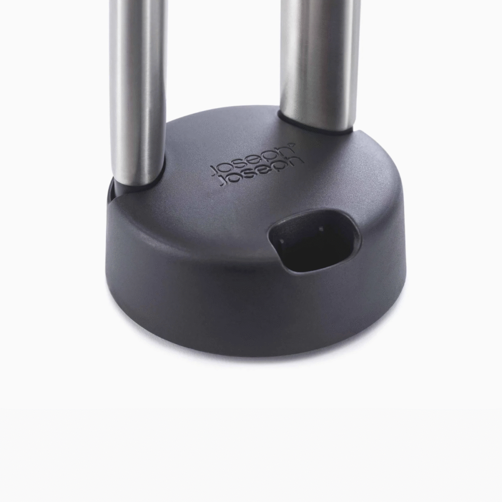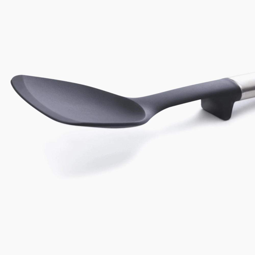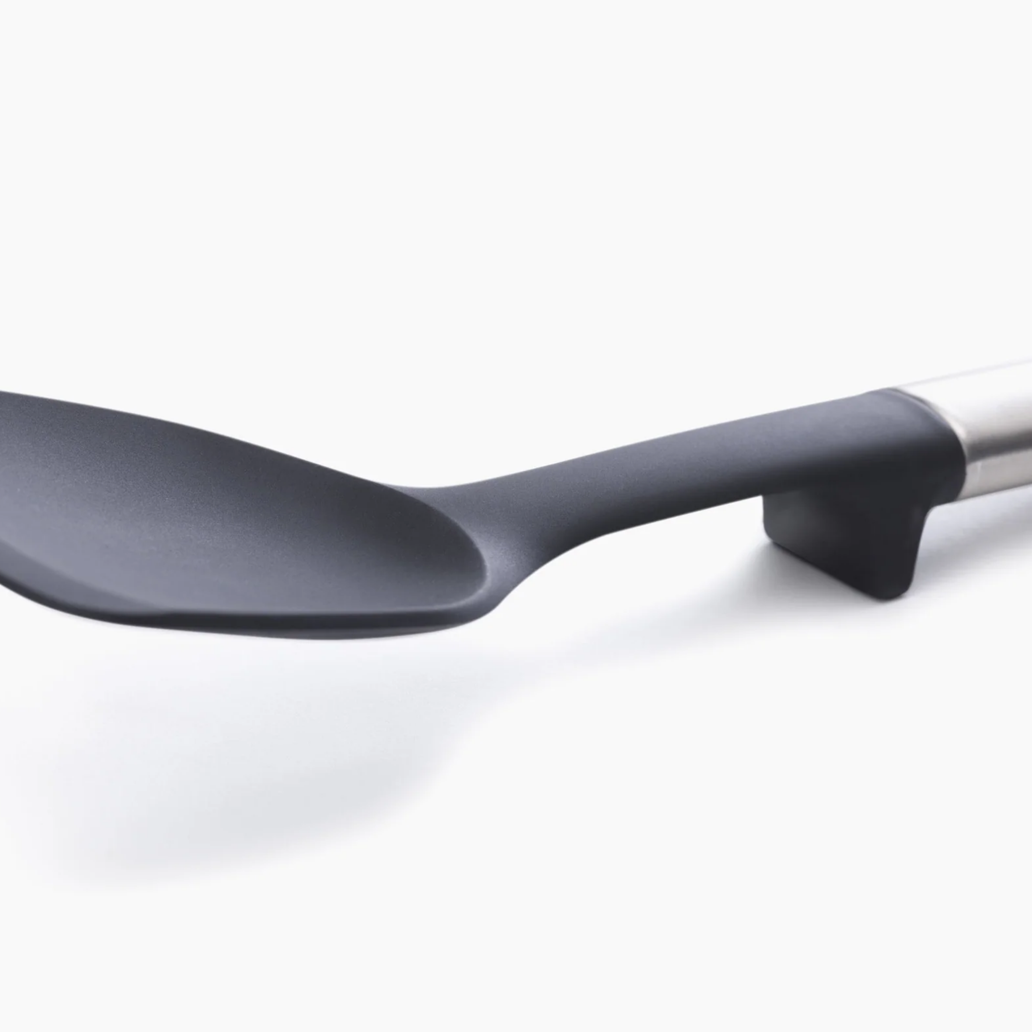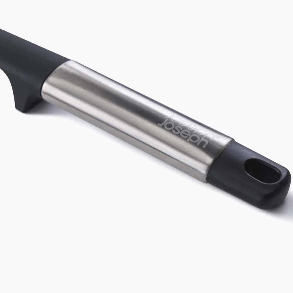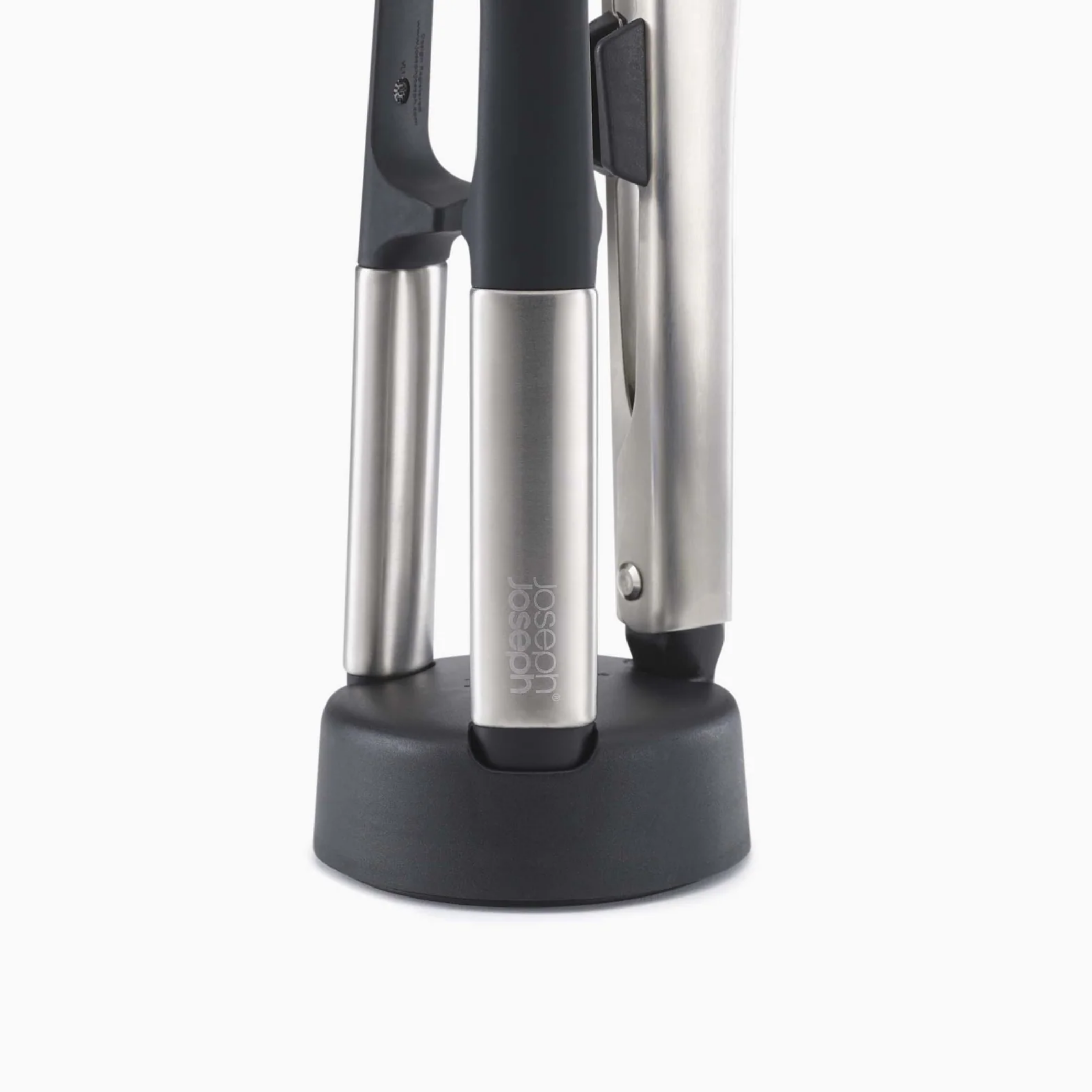 Elevate technology designed to improve hygiene and reduce mess Weighted steel handles and integrated tool rests prevent utensil heads from touching the work surface when placed down Silicone utensil heads heat-resistant up to 210˚C/410˚F Silicone tong tips heat-resistant up to 270˚C/520˚F Suitable for non-stick cookware Compact storage stand Set includes solid turner, ladle and a pair of tongs