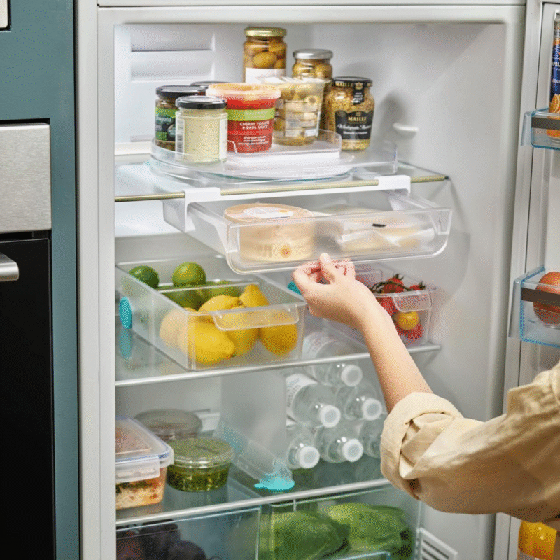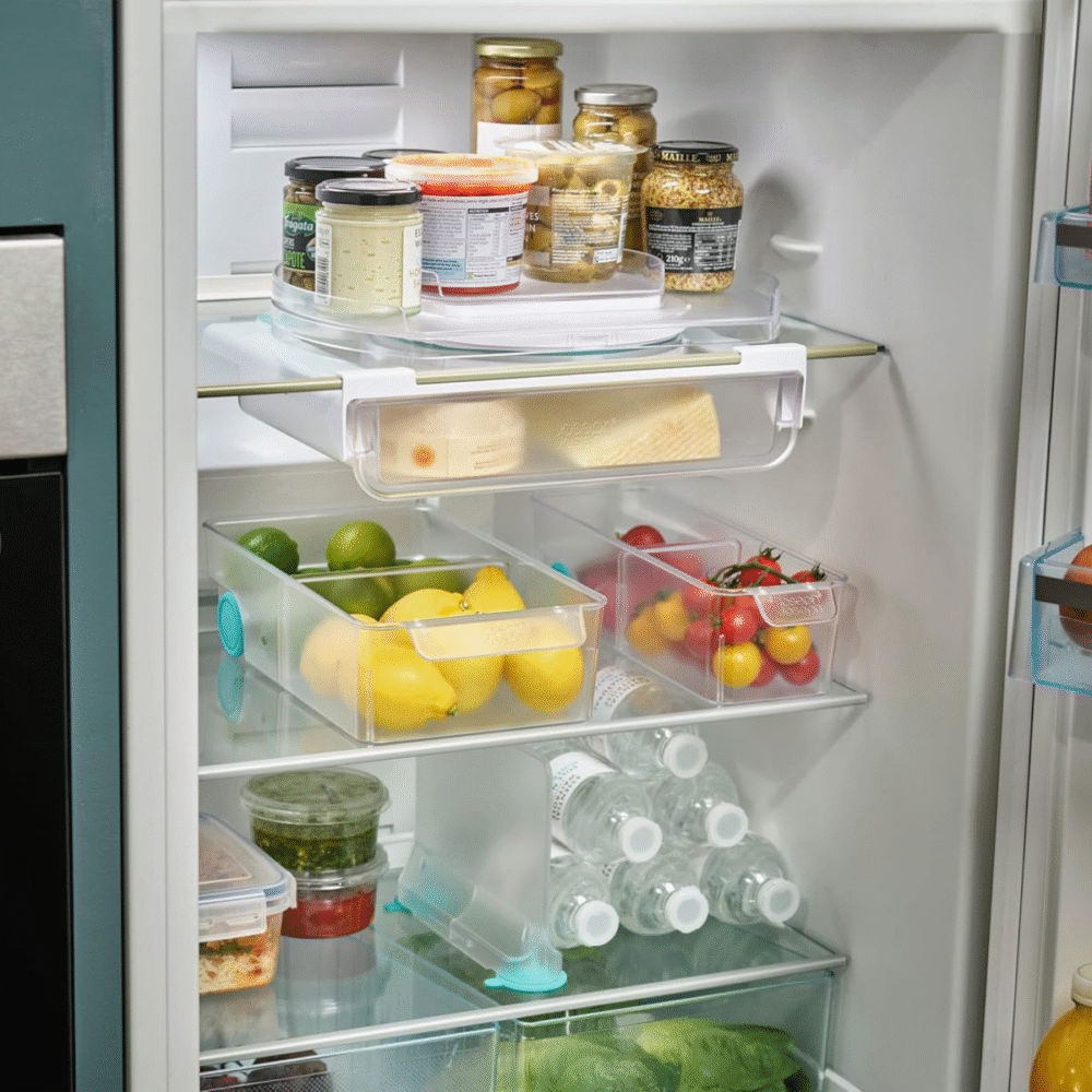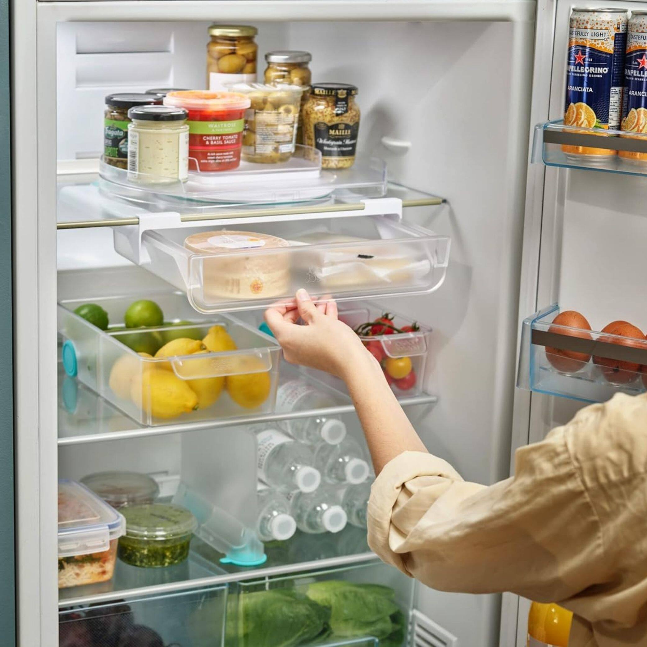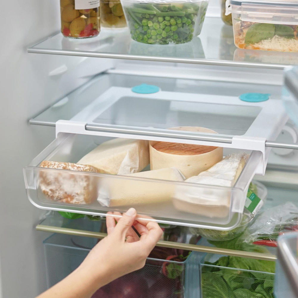 - Maximize your fridge storage space with the innovative under-shelf drawer design