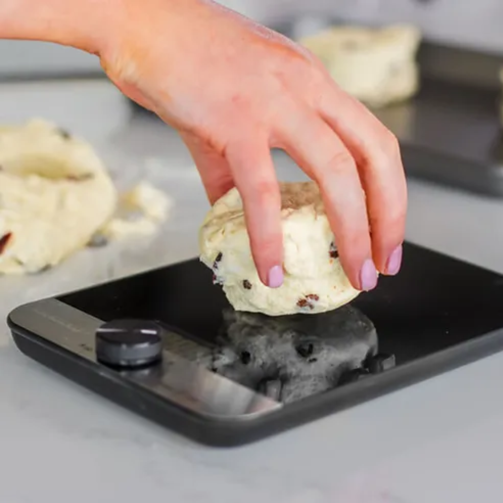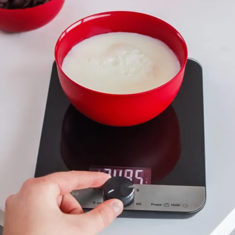 A large 2.5cm backlit readout is easy-to-read and the scales are controlled via the rotating control knob – push to power on/off and to tare; twist to set the desired unit of measurement. The handy add and weigh tare function zeros out the weight of a container before adding ingredients and also allows you to weigh all your ingredients in one container.