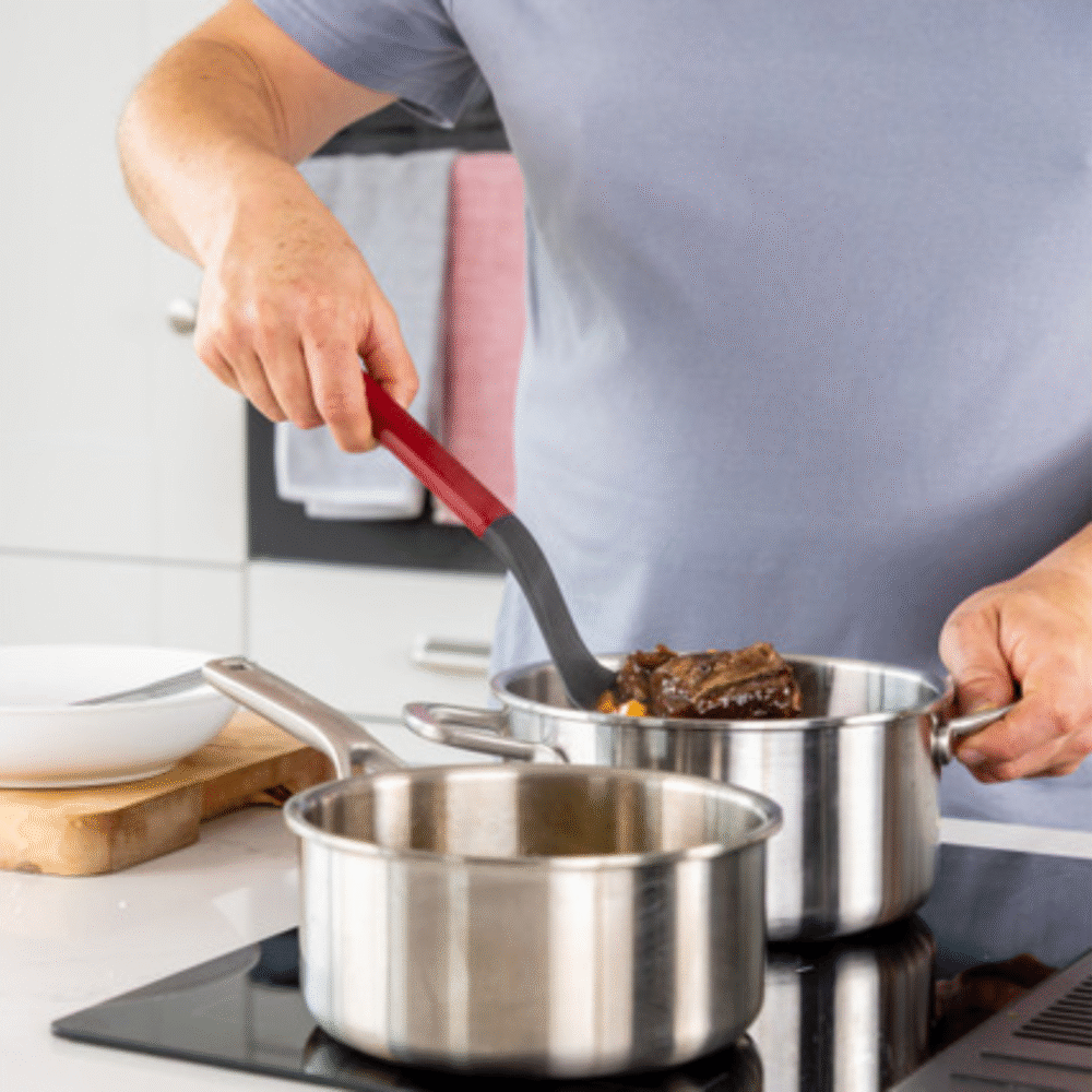 The ergonomic empire red ABS handle offers comfort, balance, and a premium grip. The handle also features a debossed logo and a handy hanging loop, perfect for showcasing your kitchen utensils. Built for daily use with high-quality materials, it’s also dishwasher safe for easy clean-up, making it a must-have kitchen essential.
