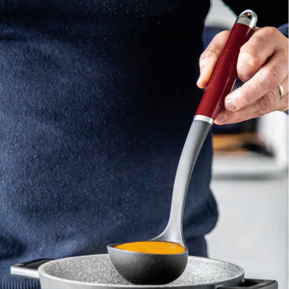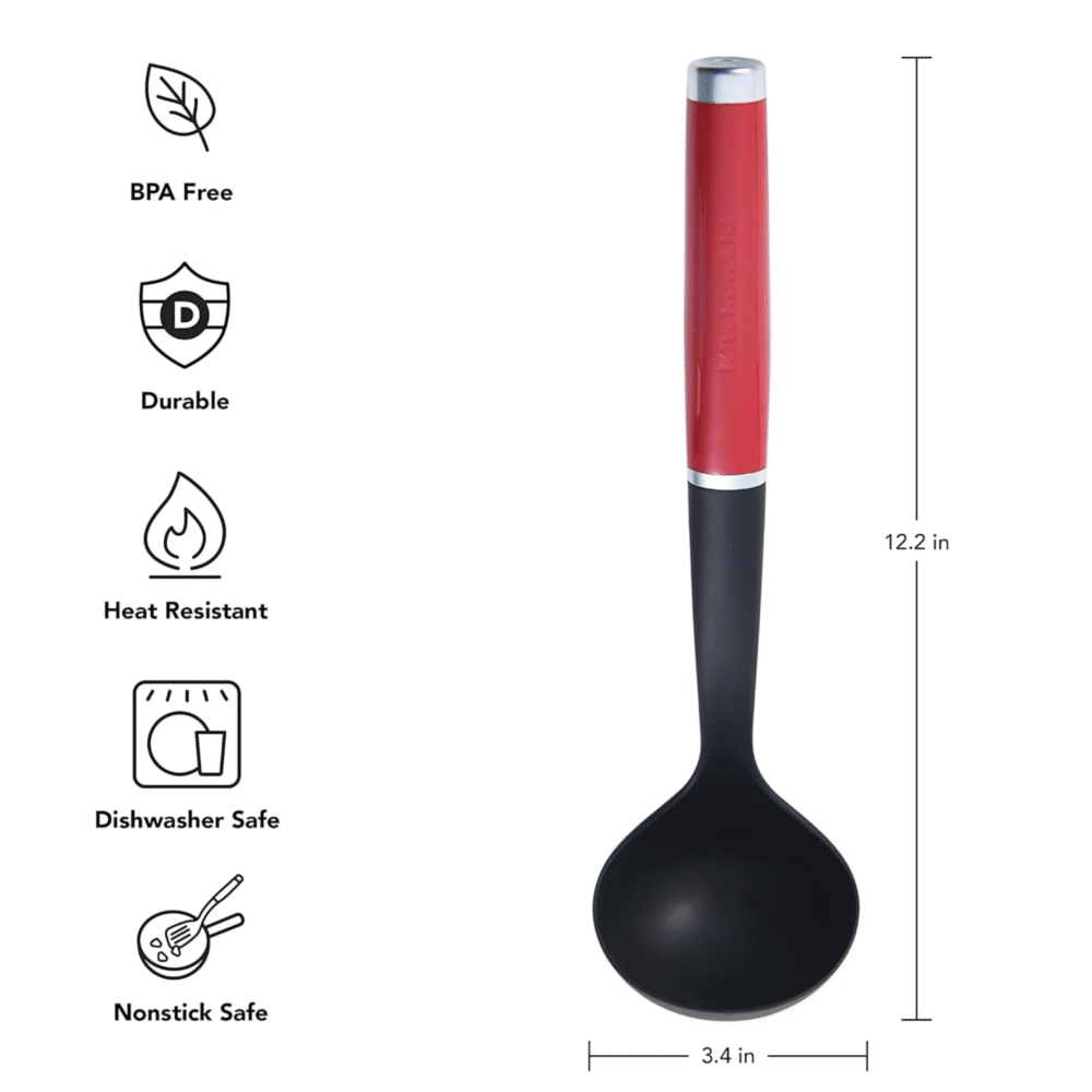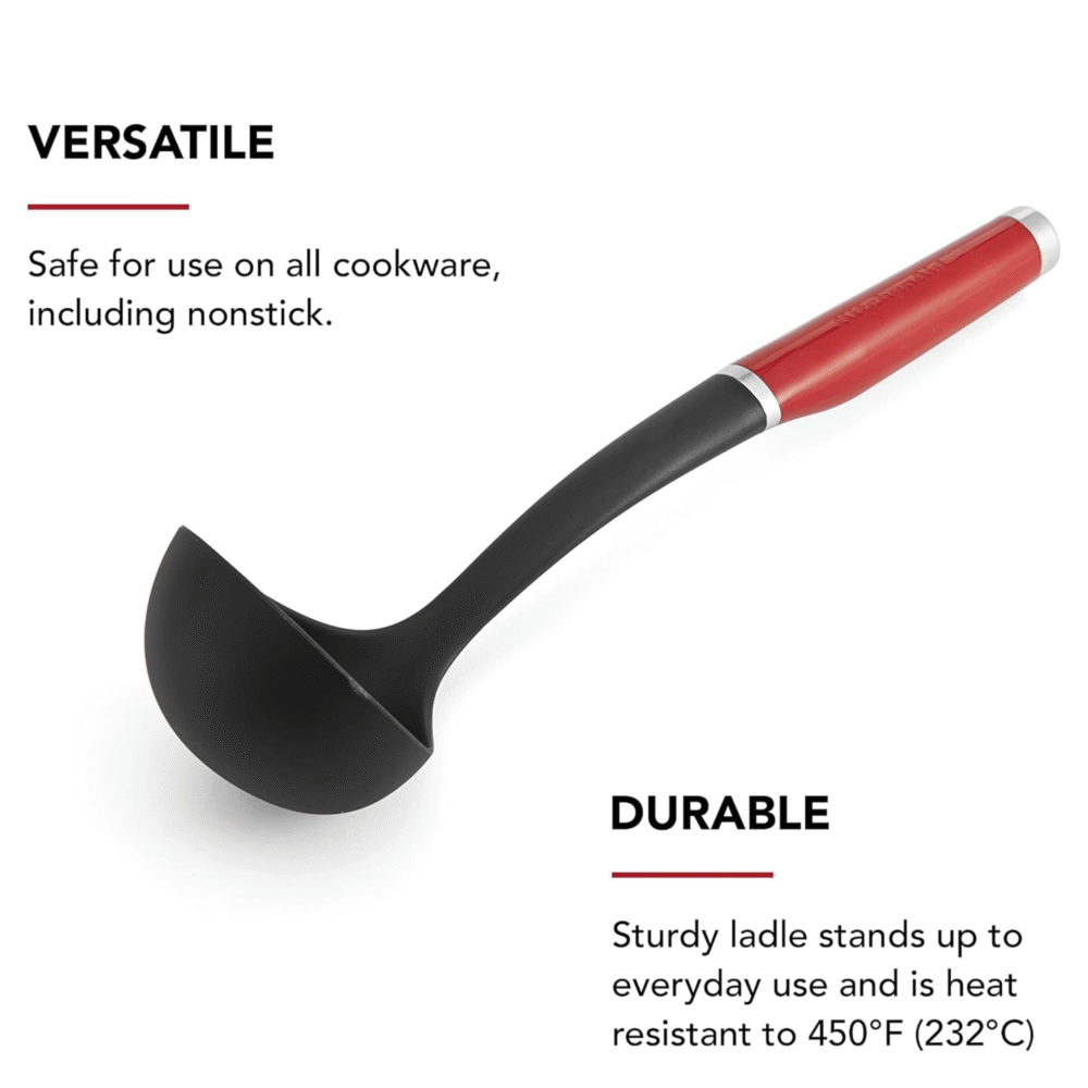 This KitchenAid nylon ladle is perfect for dishing out gravies, soups, stews, liquid dishes, dressings, and sauces. The nylon ladle is safe to use on all cookware, including non-stick and is heat resistant to 450°f/232°c.