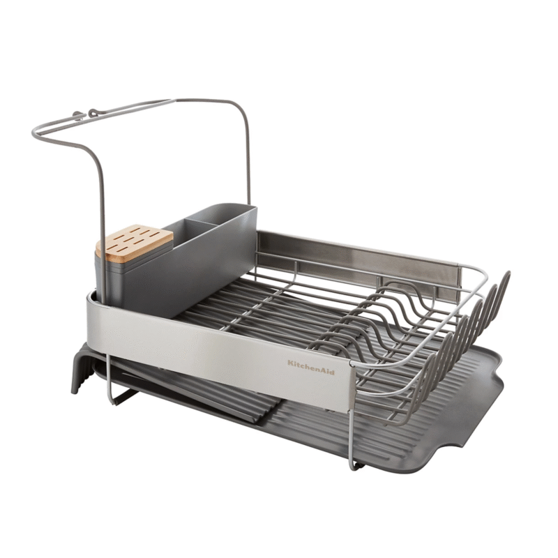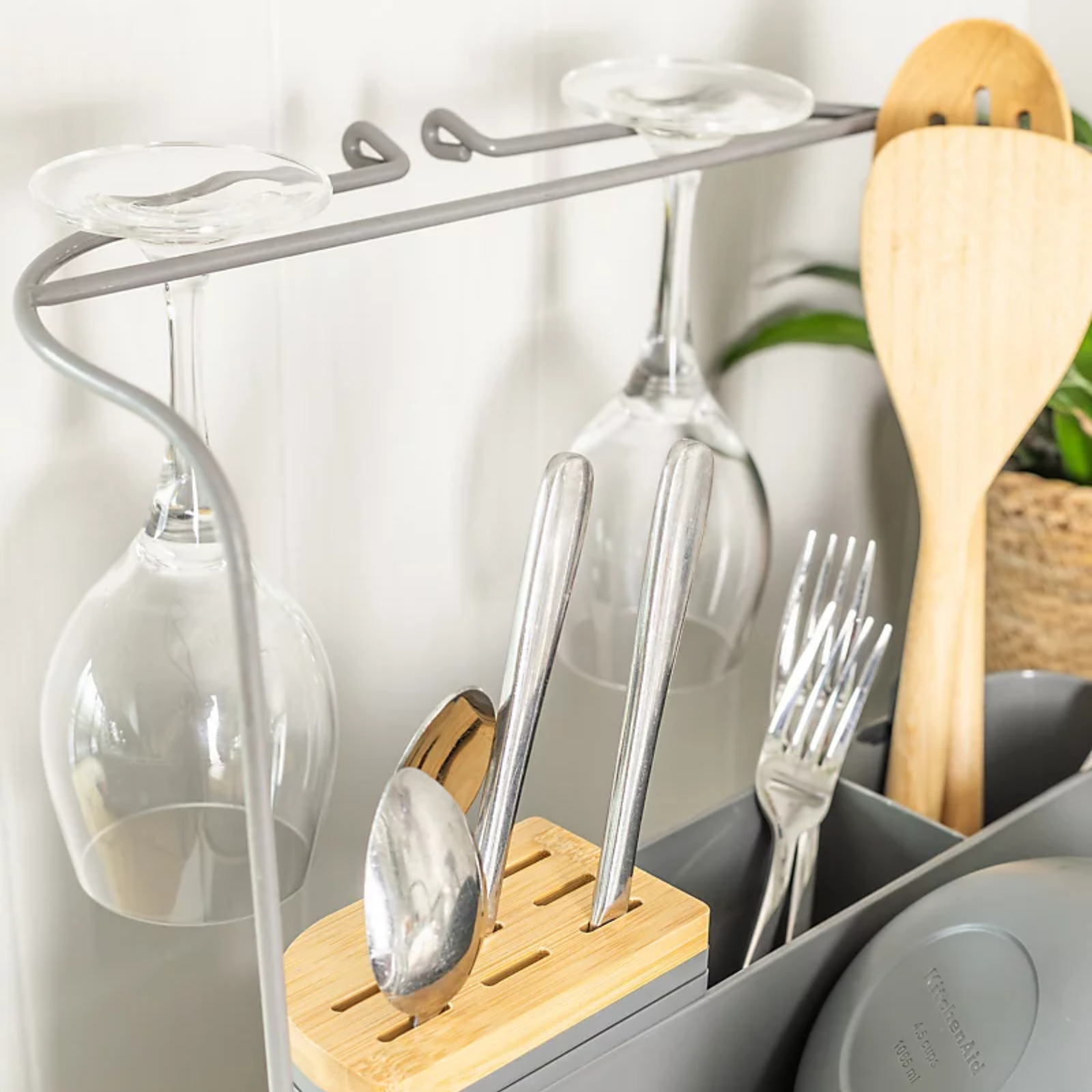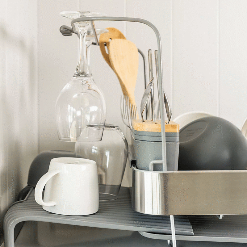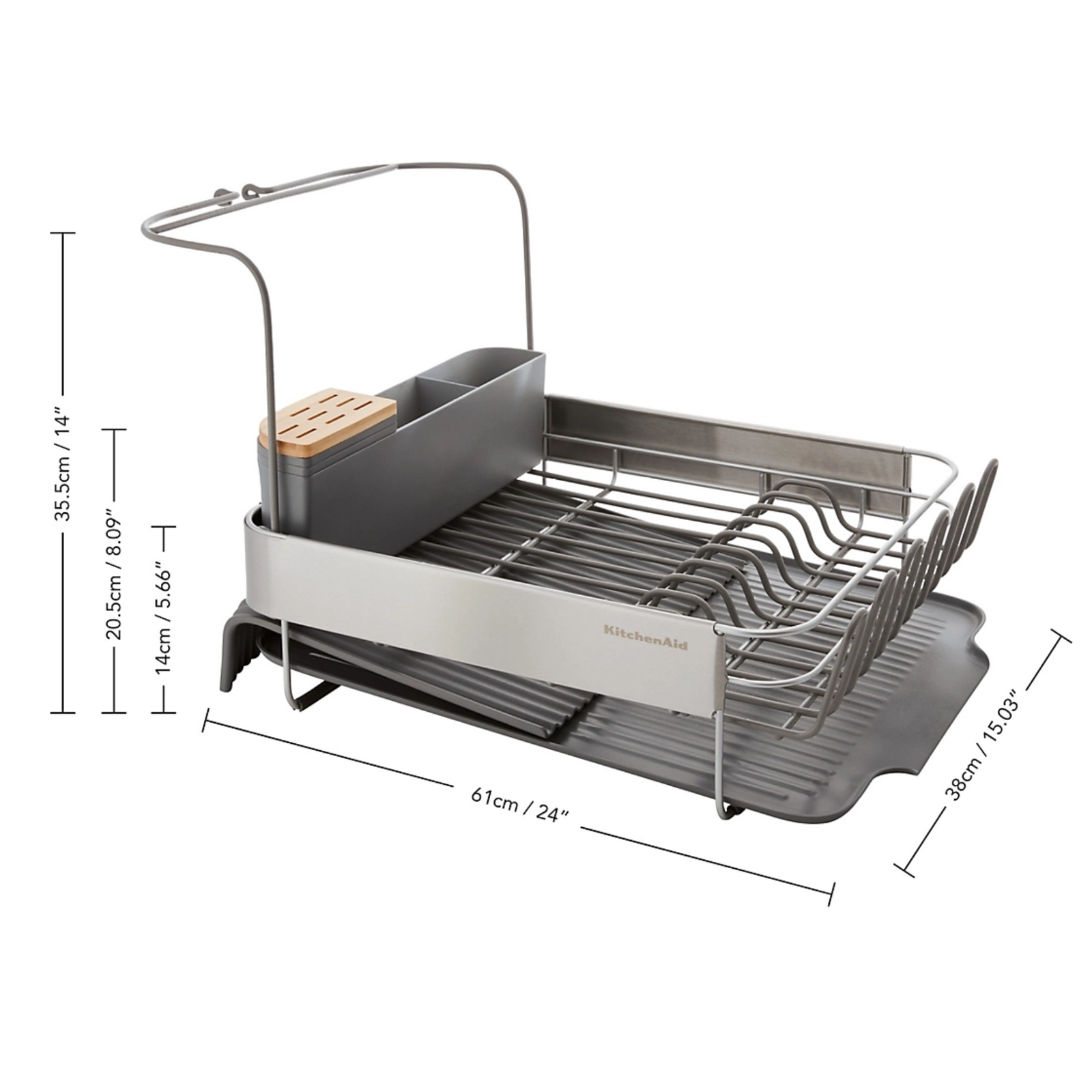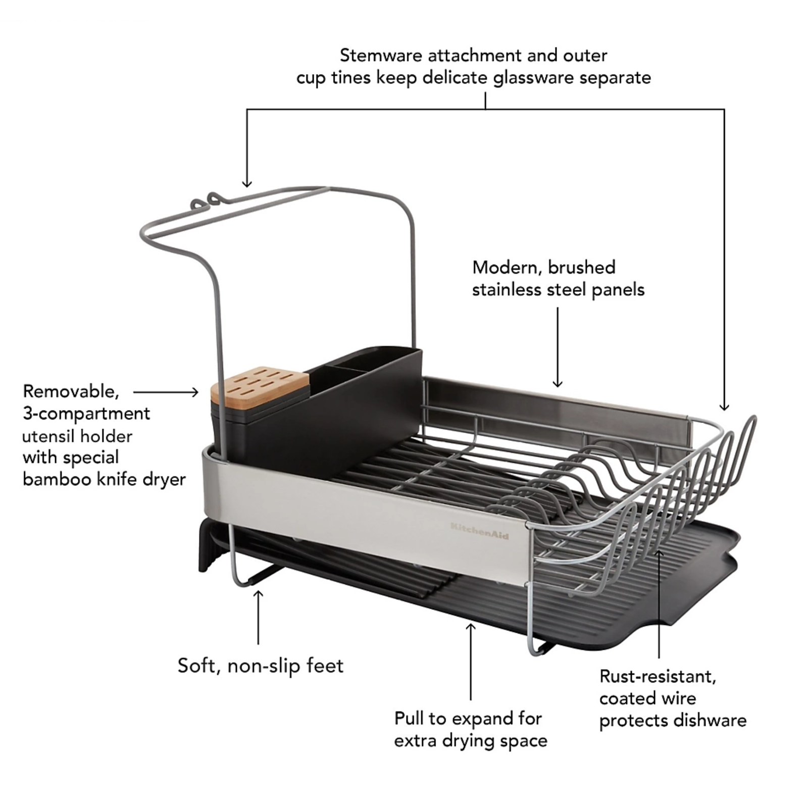 Keep your kitchen sink organised in style with the KitchenAid Expandable Dish-Drying Rack with Glassware Attachment. Super easy to use, simply pull to expand the secondary draining board for additional drying space when the occasion calls.