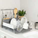 The angled draining board directs water back into the sink, and there is also an additional glassware attachment to hang your wine glasses safely. It holds 11 plates, 6 cups and 4 stemware glasses. Handwash only.