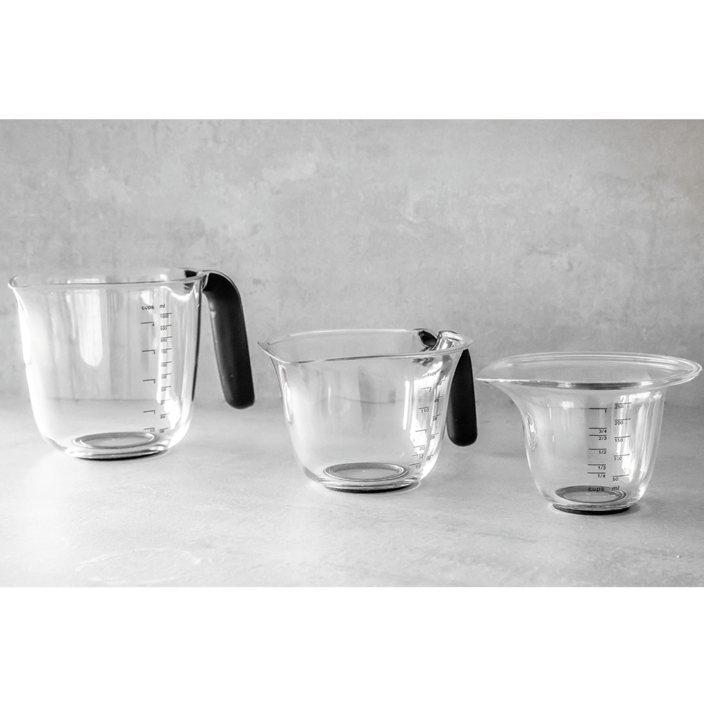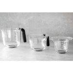 Each jug features a non-slip handle and integrated pouring spout for easy, mess-free pouring. The jugs accurately measure both wet and dry ingredients, and can nest inside each other for space-saving storage.