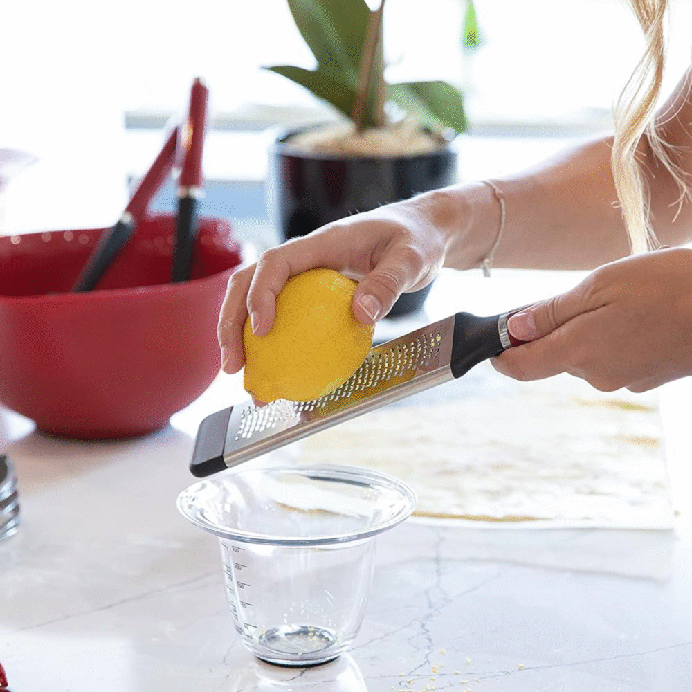 This KitchenAid measuring jug set includes jugs in three different sizes. The jugs are crafted from BPA-free plastic and contain easy-to-read measurement markings in both standard and metric units.