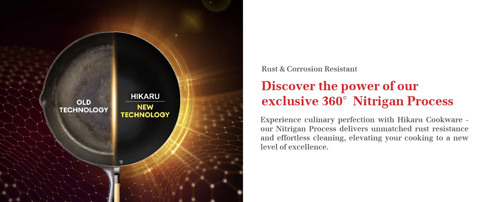 Hikaru use a special nitrigan heat treatment process that changes the surface of the specially formulated steel to create a hardened surface. The structure and DNA of the material is altered resulting in a material that is HIGHLY RESISISTANT TO RUST and INCREDIBLY STRONG AND DURABLE. No chemicals are added which makes the special nitrigan treatment on special formulated steel a healthy alternative to PTFE coating cookware.