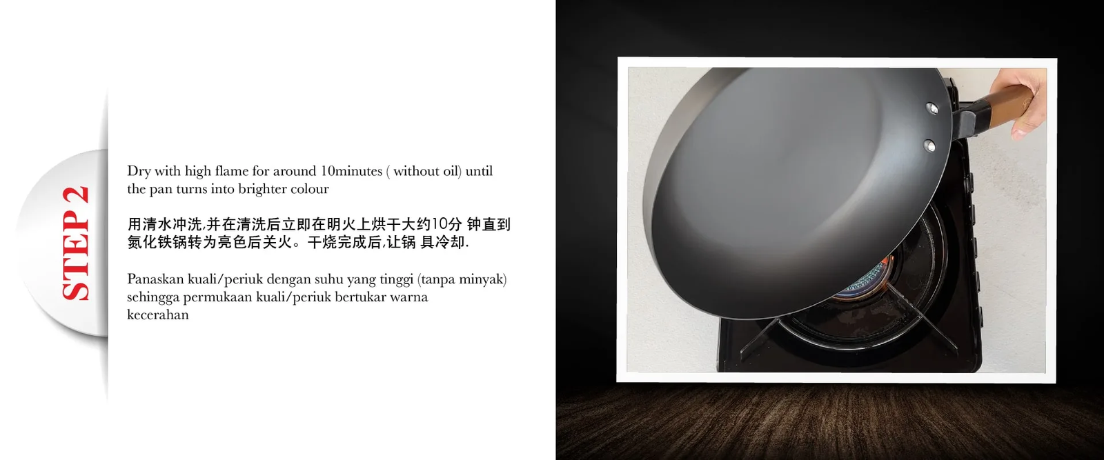 - When using your pan for stewing, steaming, or boiling, the hot water used may remove parts of the pan’s oil patina. To avoid this, please wash and dry the pan thoroughly then use the routine oil conditioning on the pan.