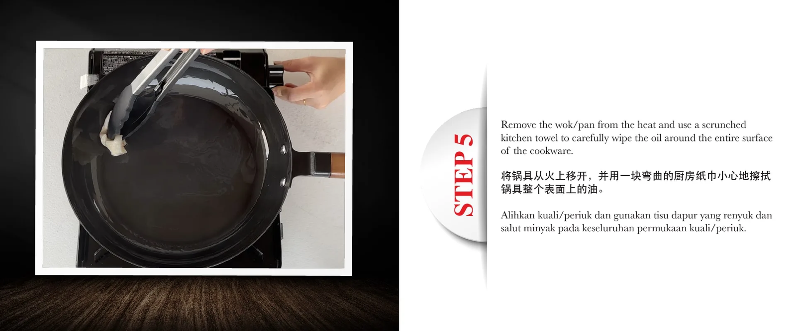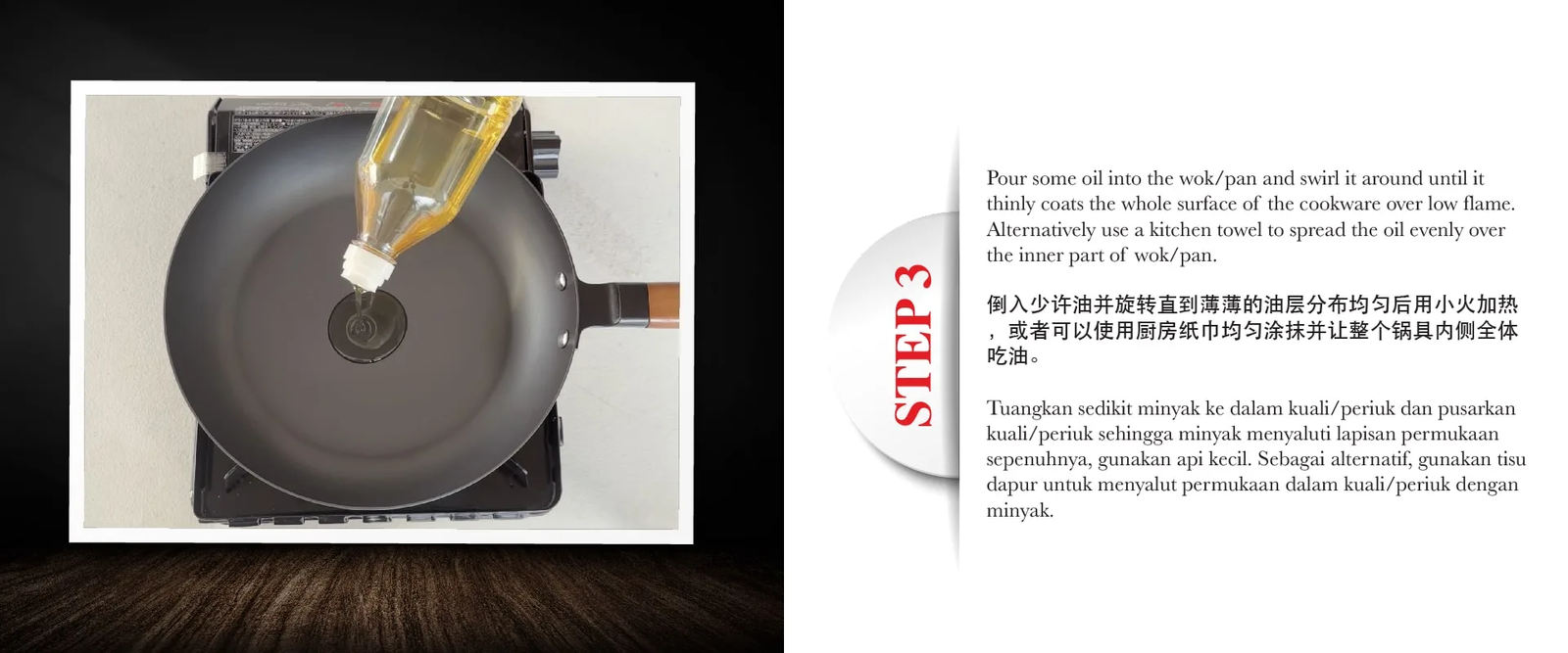 - Should the pan require deep cleaning with a detergent, apply oil evenly to the surface after cleaning.