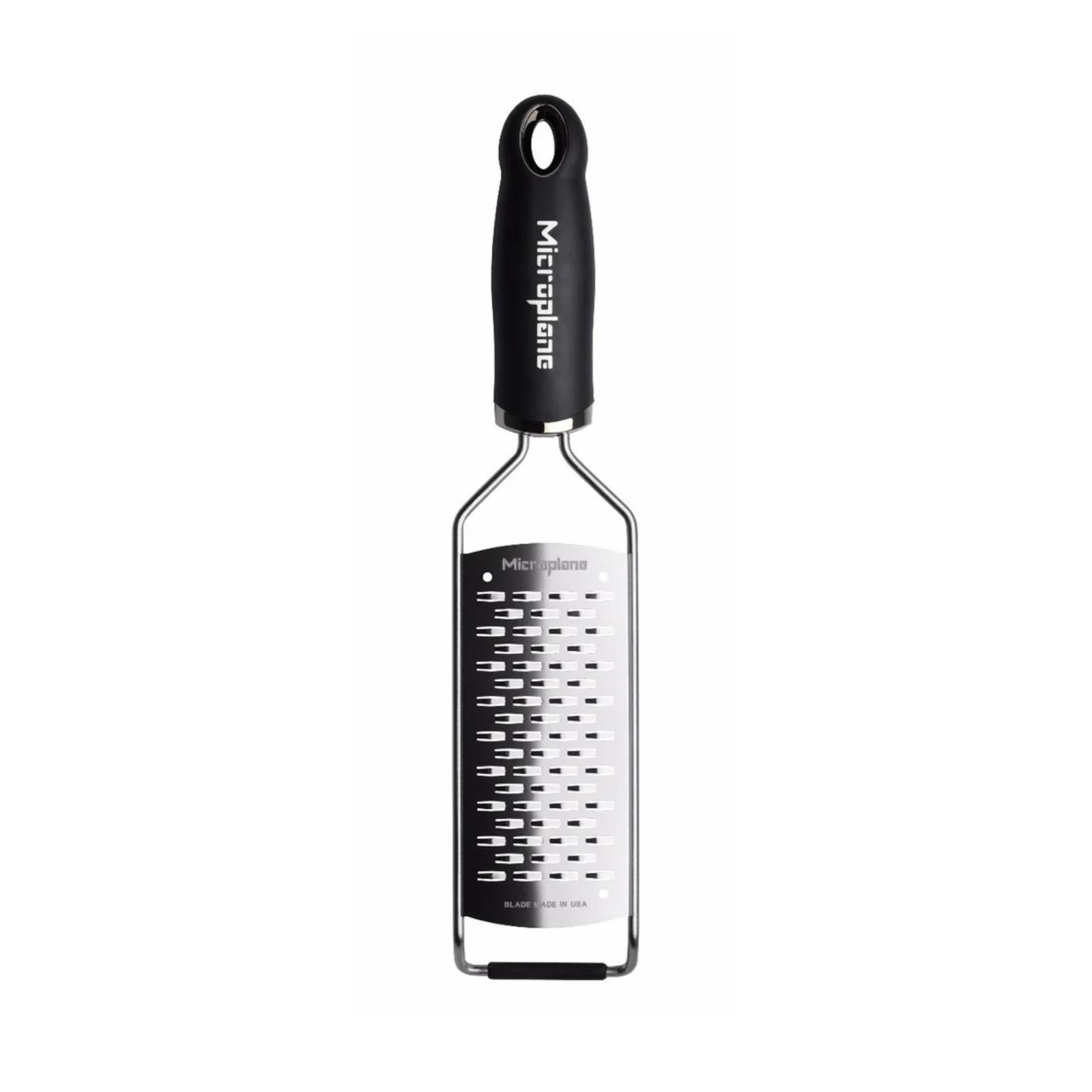 The Microplane Gourmet Series has an expansive paddled with ample grating surfaces and US made stainless steel blades. Ultra-sharp photo etched teeth make fast work out of grating potatoes, carrots, onions and cheeses. The Stainless steel frame provides extraordinary durability. The soft-touch handle matches back to the premium classic series zesters. The non-skid foot adds stability when grating on counters and plates.