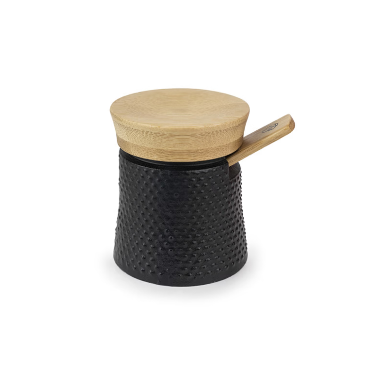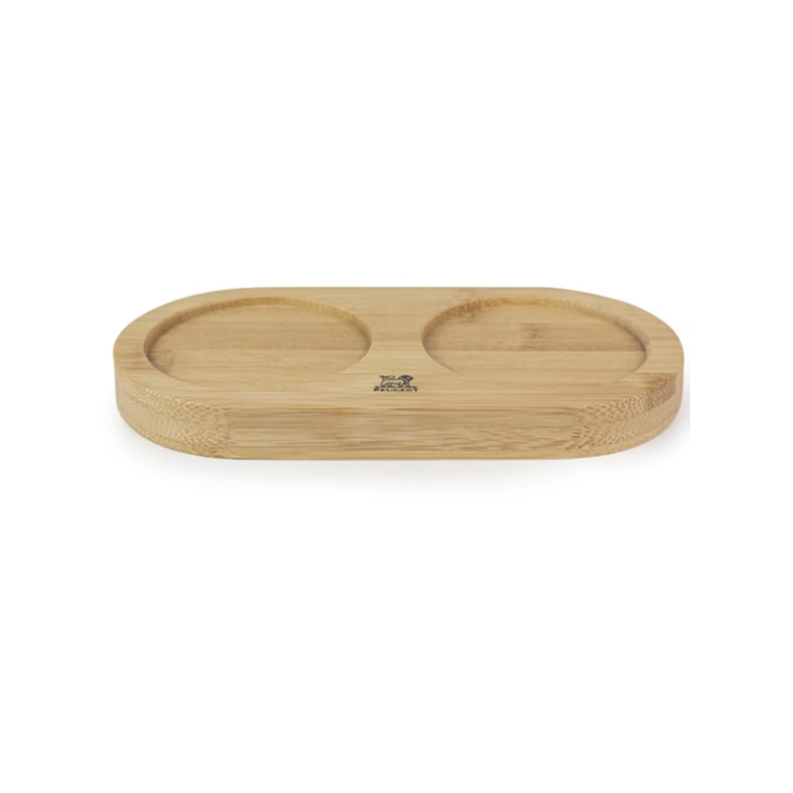 The bamboo storage base with its warm finish provides a unique showcase for these two magnificent cast-iron pieces: an 8 cm – 3 1/4 in pepper mill and a salt cellar with lid and a delicate bamboo spoon deliver the perfect dose of salt.