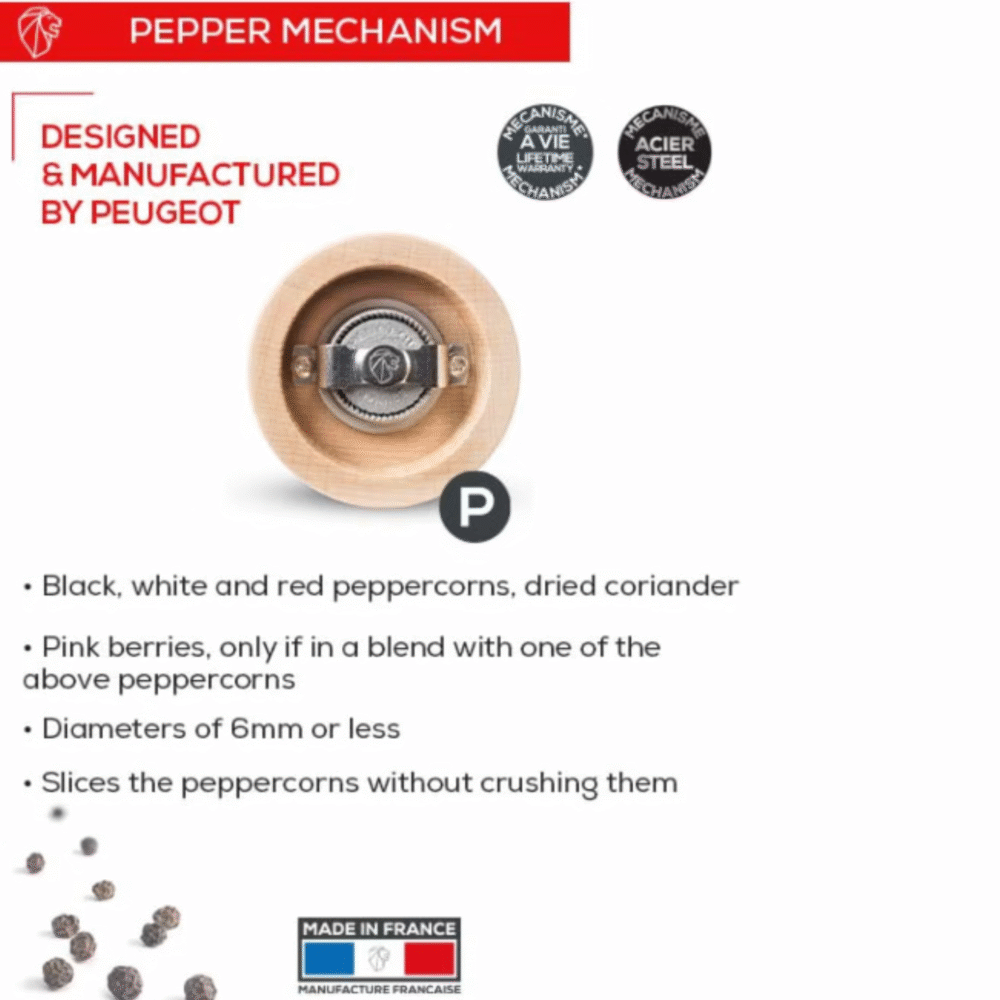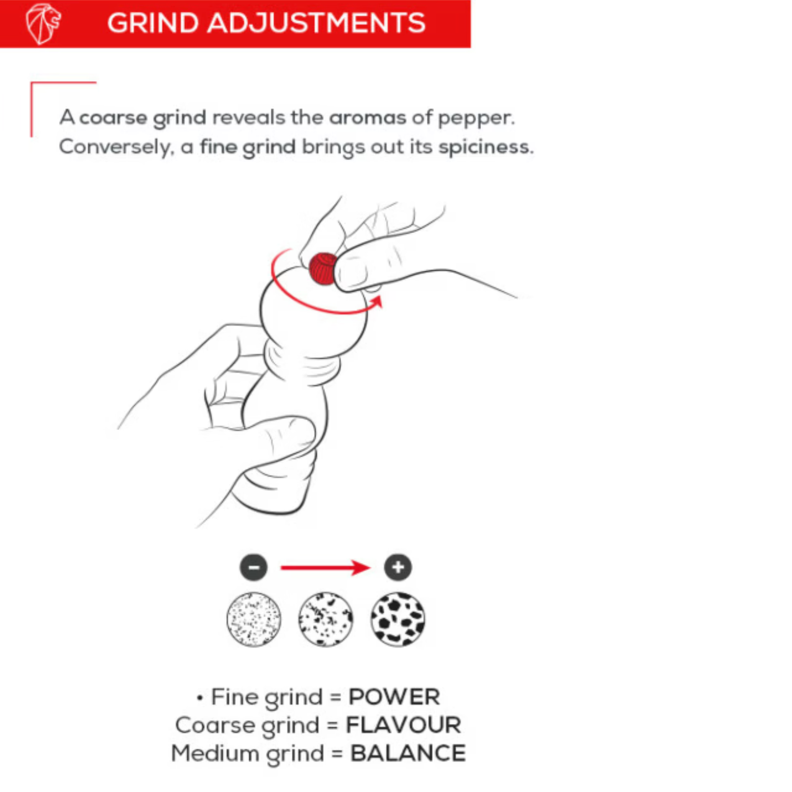 For grinding black, white, green and red pepper, pink peppercorns (no more than 15% in a pepper blend) and Sichuan pepper – Grind adjustment button: the more the button is screwed, the finer the grind, and vice versa.