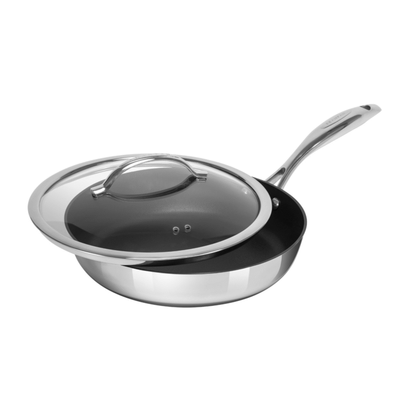The new Stratanium+ non-stick surface provides exceptional searing results with little or no oil, a restaurant grade high quality coating suitable for metal utensils and intensive use. With a basic new technology, SCANPAN have succeeded in creating a surface that surpasses all the past in terms of hardness and thus strength and durability. The 5 ply body with a core of 93% – 96% recycled aluminium and outer layer of stainless steel allows for optimum heat distribution and maximum durability. Designed for use on all cooktops including induction.