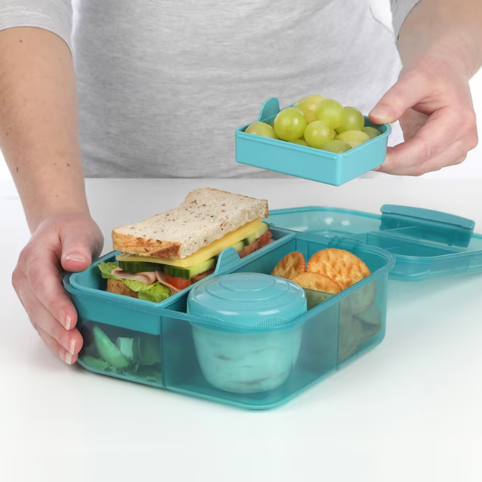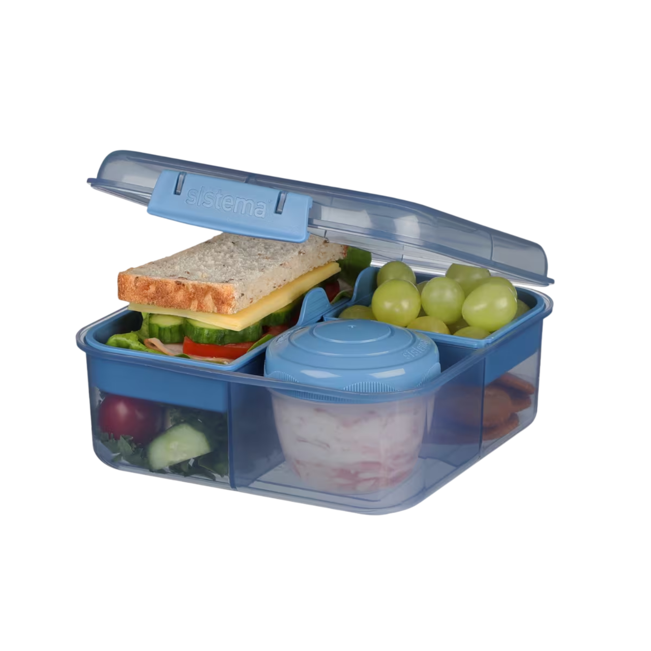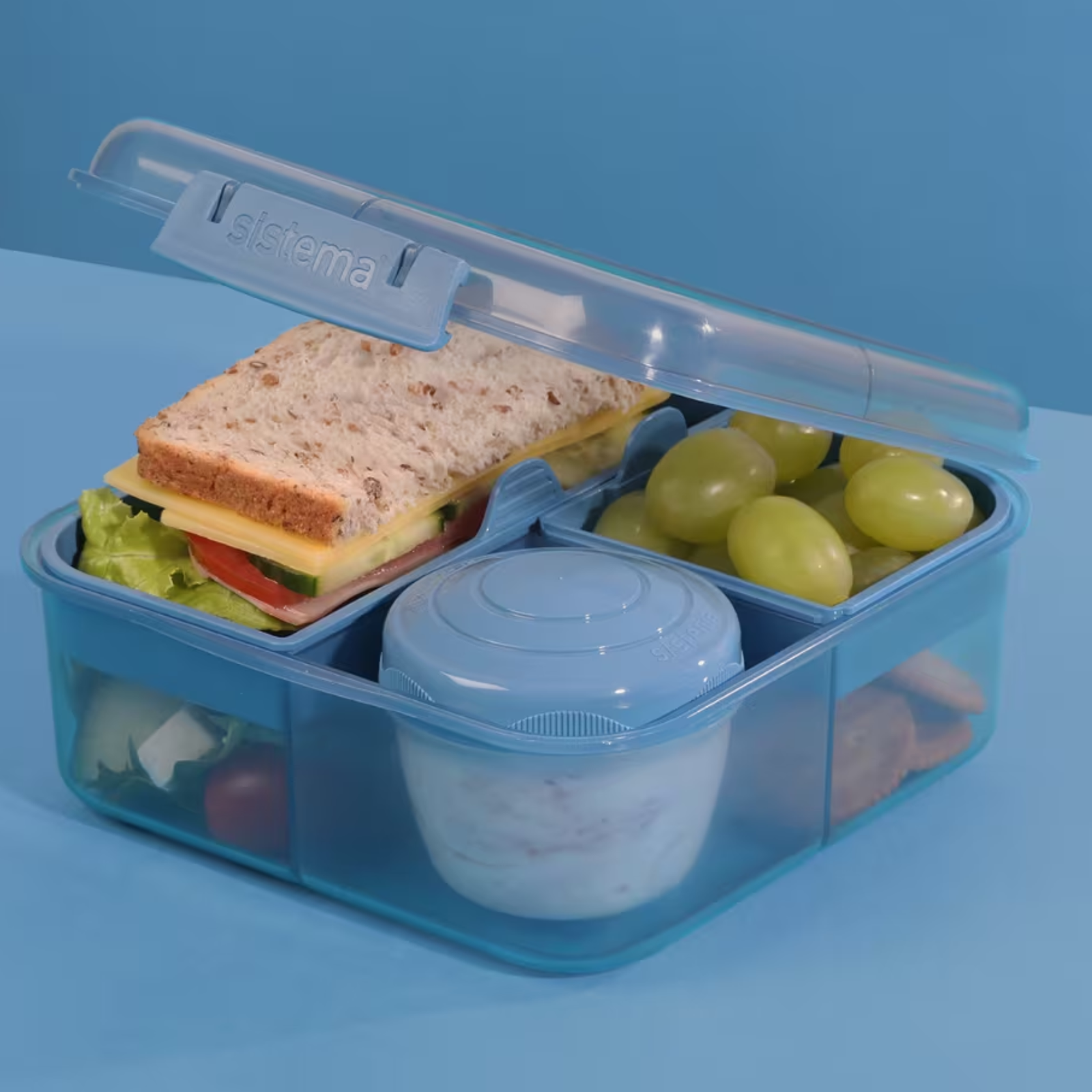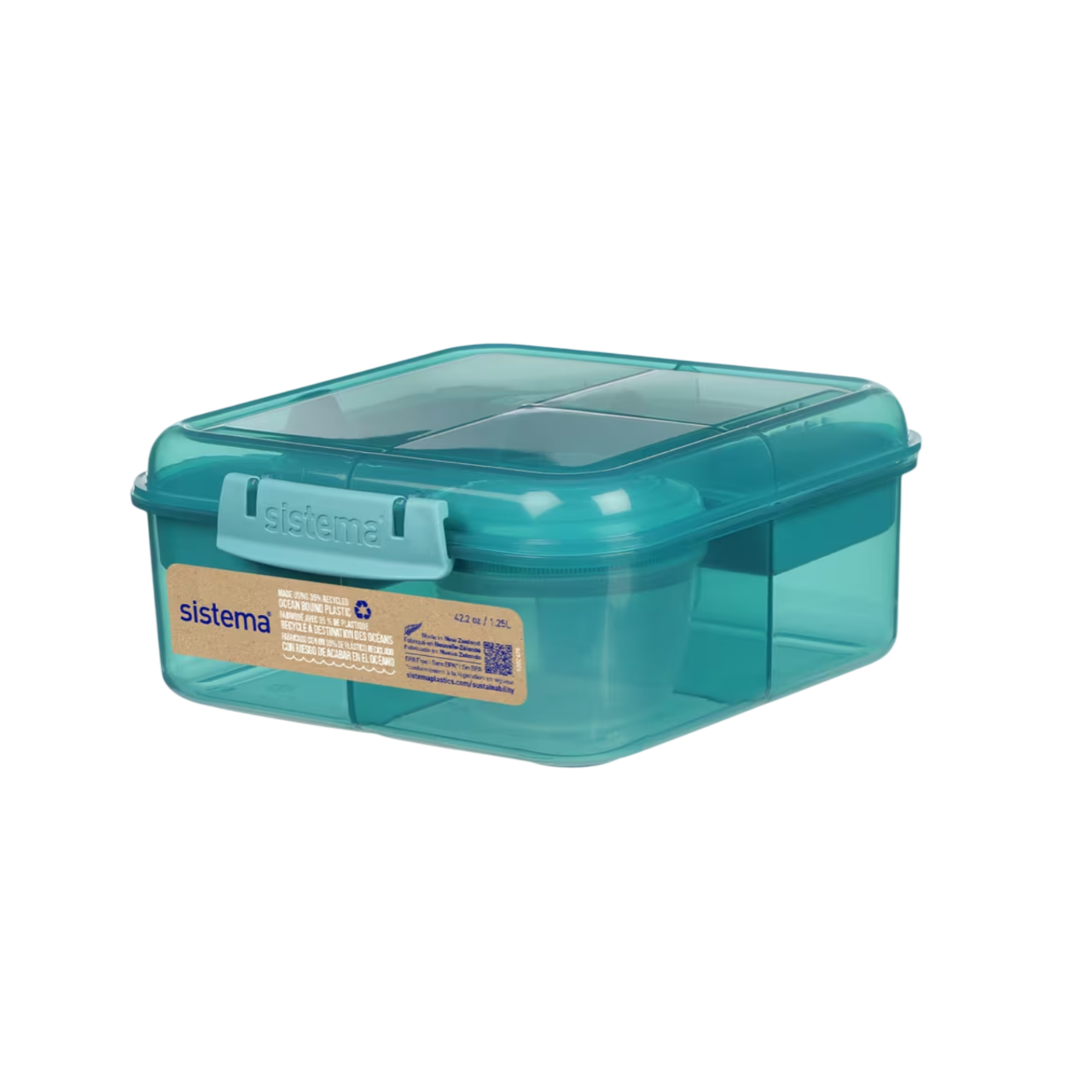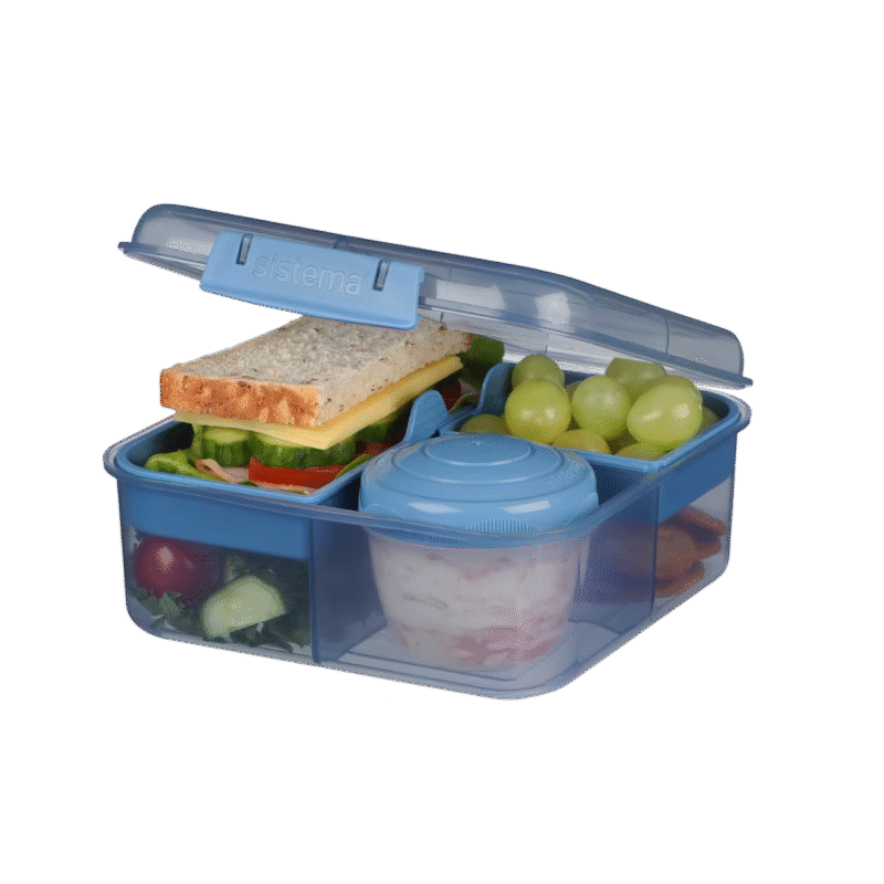 The Sistema® 1.25 L Bento Cube with Yogurt Pot contains 35% recycled ocean bound plastic. It is food-safe, durable, and reusable, making it the perfect choice for all lifestyles. With its eco-friendly design, you can help reduce the need for plastic bags, cling film and foil, and contribute to a cleaner environment.