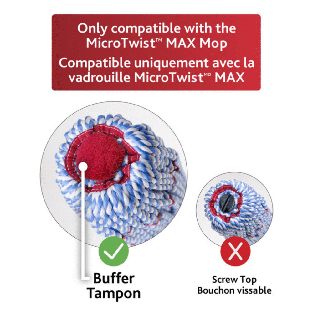 Designed for use with the MicroTwist™ MAX Microfibre Twist Mop, this 18” extra-large mop head replacement covers more flooring and cleans floors quickly. It features a buffering pad for extra cleaning power on stubborn dirt, tangle-free microfibre strands that trap and absorb dirt, dust, hair, and moisture, and efficiently removes over 99% of bacteria with just water.*