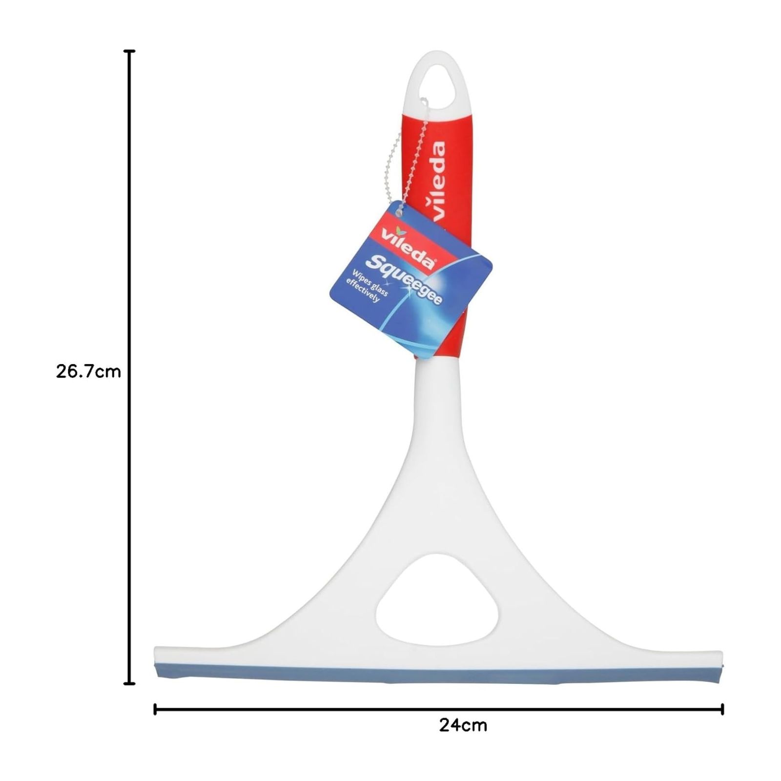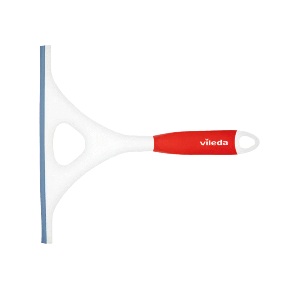 The Vileda squeegee effectively wipes excess water from glass surfaces such as windows and showers. Ergonomic handle with comfort grip and flexible rubber lip for continuous surface contact.