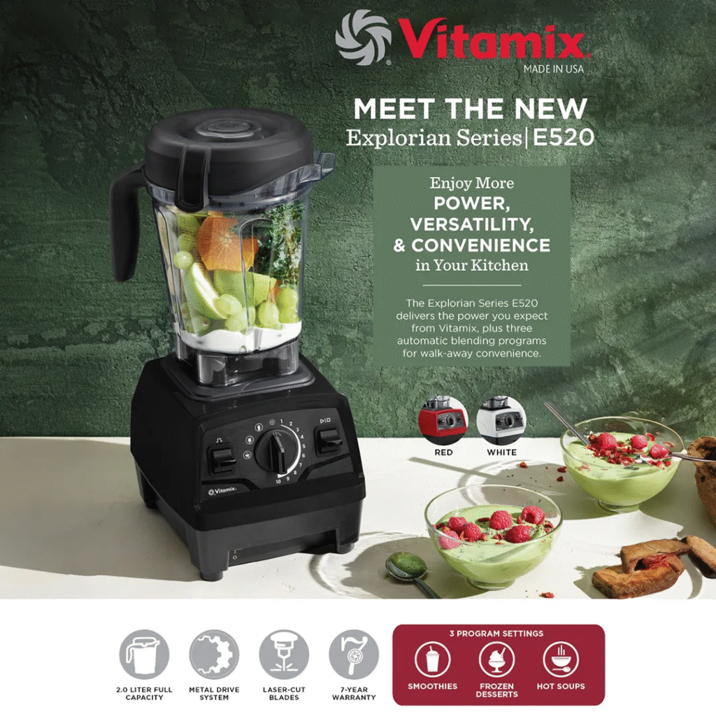 The Vitamix Explorian E520 high performance blender has the same high quality performance and is as user-friendly and versatile as the other Vitamix machines.