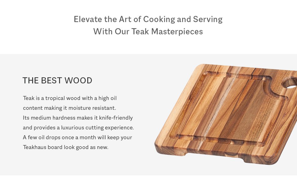Naturally beautiful, moisture-resistant, and high in oil content, teakwood is knife-friendly, easy to maintain, and built to last.