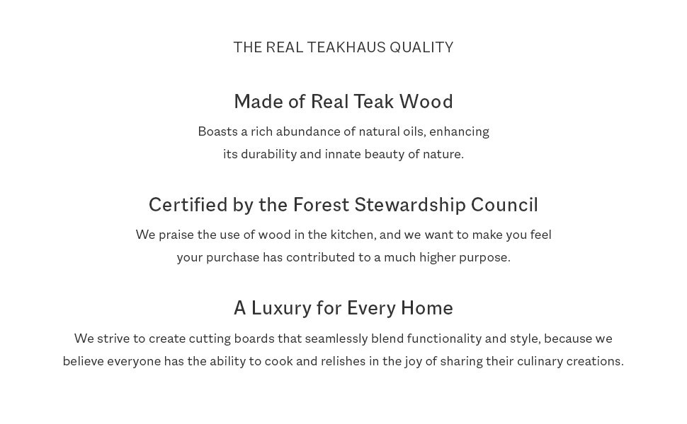Teakhaus cutting boards are crafted for food lovers who value quality and sustainability, made from 100% FSC®-certified sustainable teakwood.